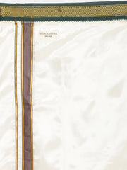 This shirt readymade dhoti and angavastram set for men is designed and crafted from Sethukrishna. The shirt is made of artsilk features spread collar, chest pocket, full sleeves and straight hem and it is paired with artsilk pocket dhoti and angavastram in contrast borders. Choose to wear it for any traditional occasion like wedding or ethnic party in style.