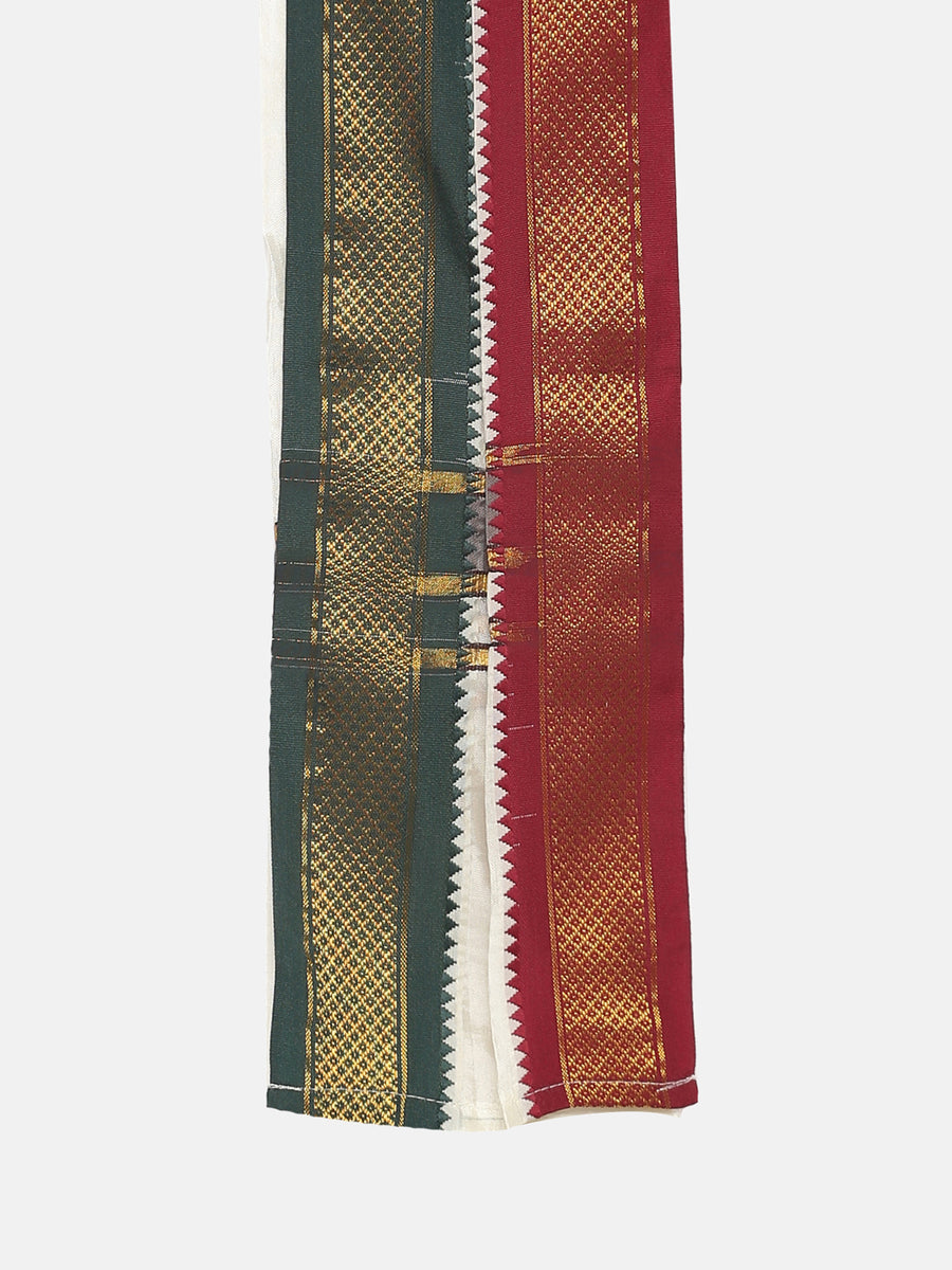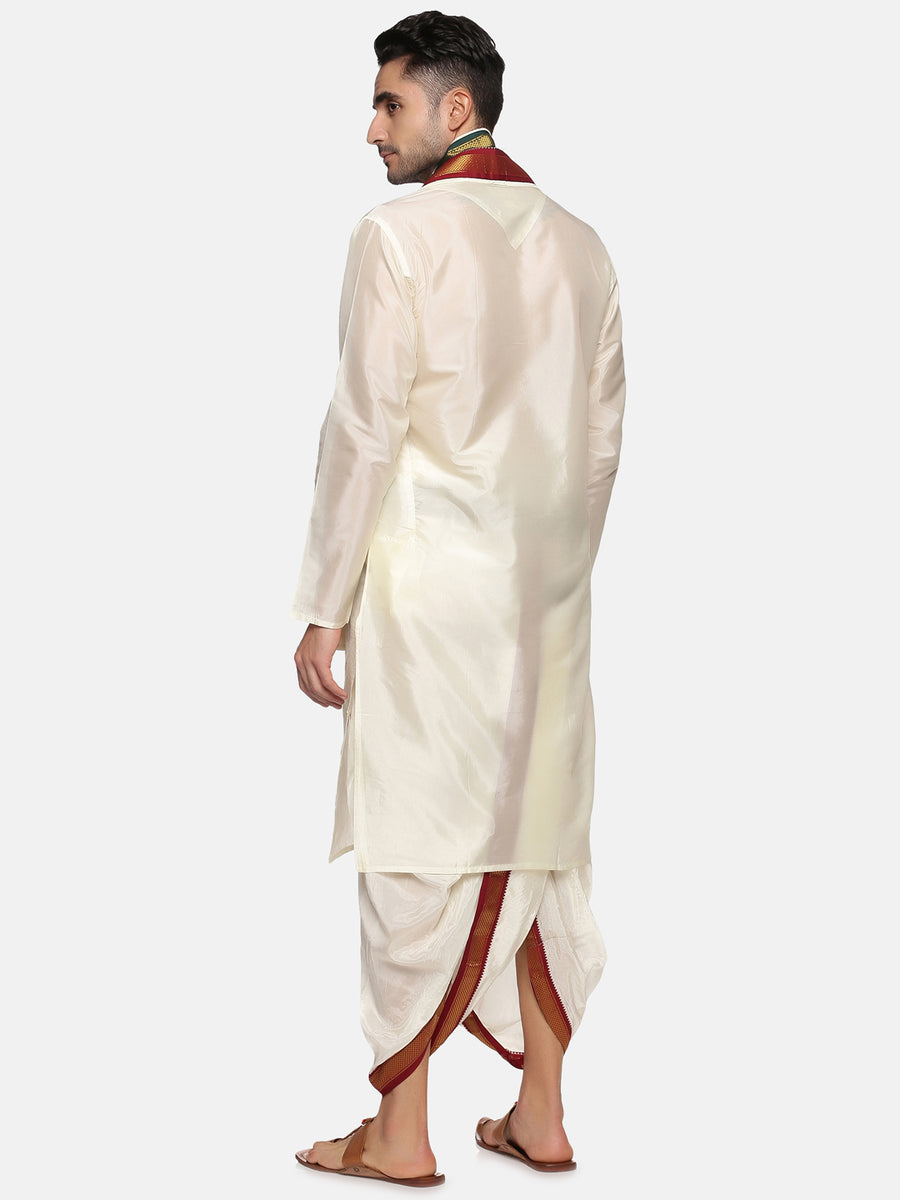 This kurta dhoti pant set for men is designed and crafted from sethukrishna. The kurta is made of cream artsilk featuring mandarin collar, side pockets, full sleeves and straight hem and it is paired with cream silk pant with gold jari border. Choose to wear it for any traditional occasion in style.