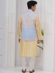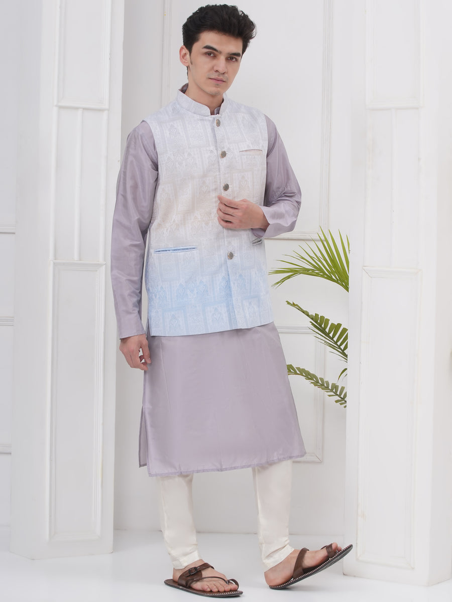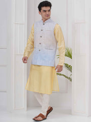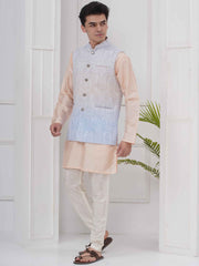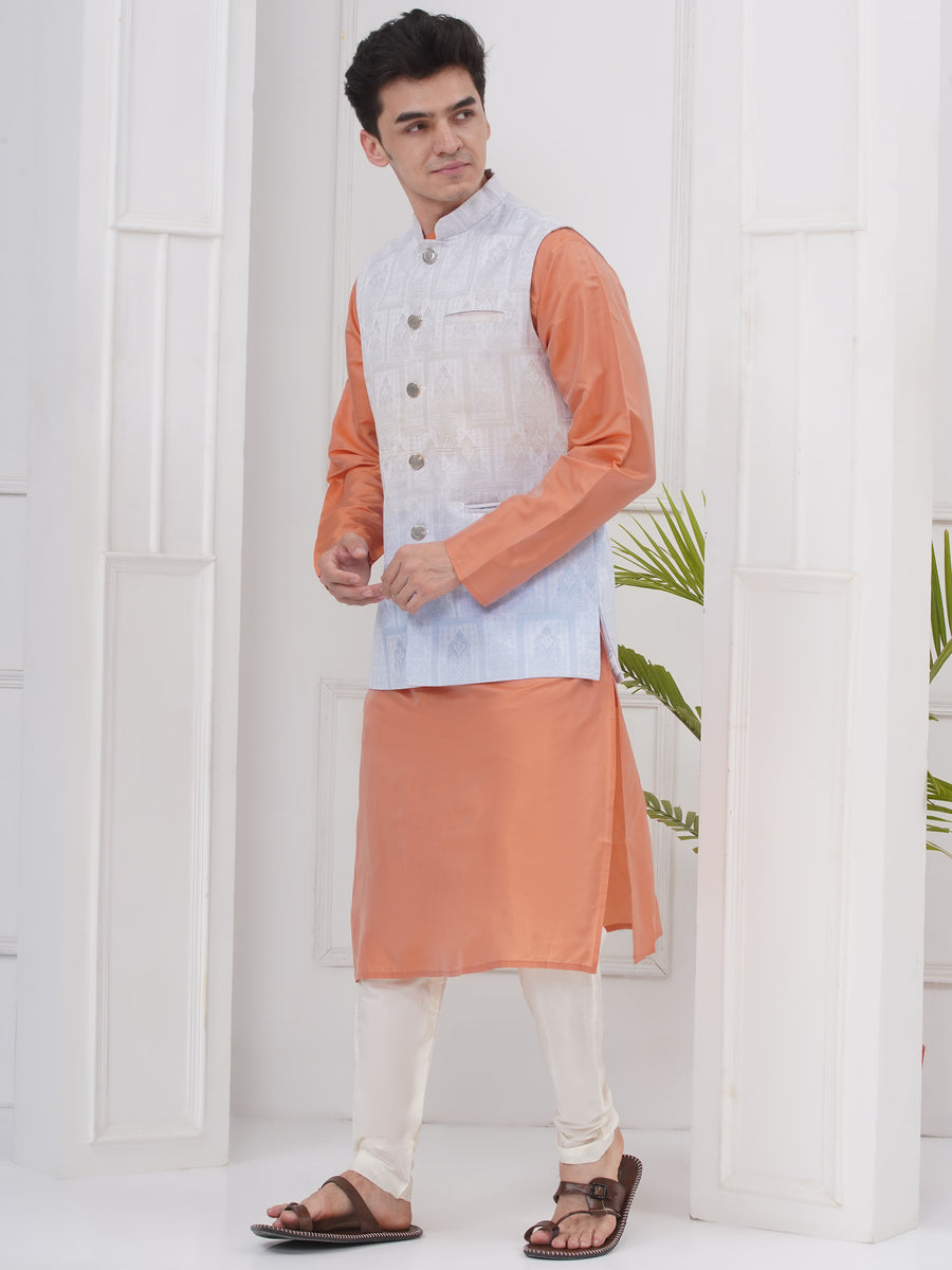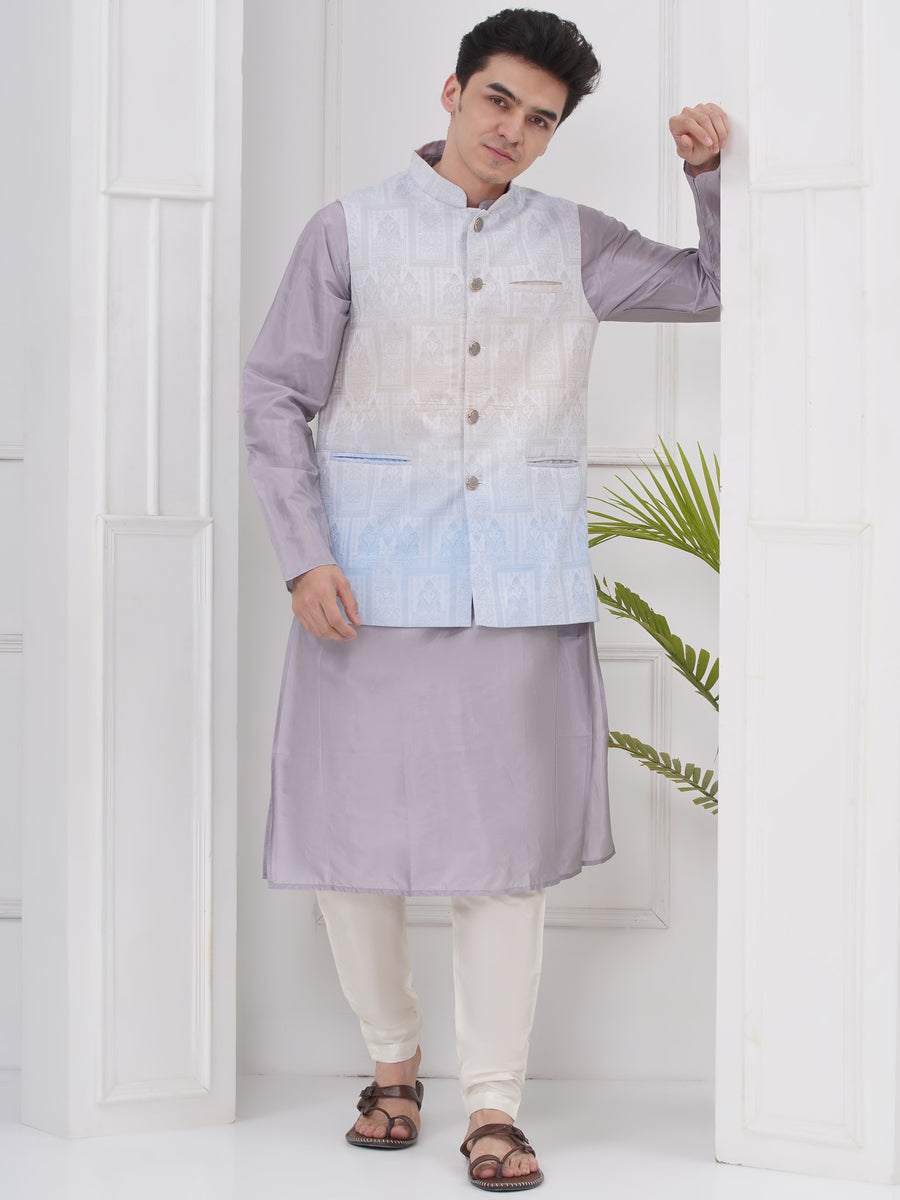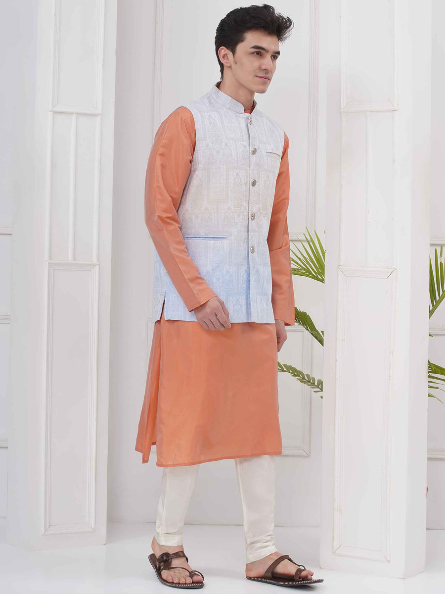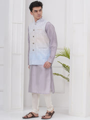 Elevate your ethnic wardrobe with this ready-to-wear three-piece kurta set—a balanced blend of tradition, comfort, and style. Crafted from breathable cotton poplin fabric, the set includes a printed kurta, matching pyjama, and a complementary Nehru jacket designed to complete the look effortlessly.