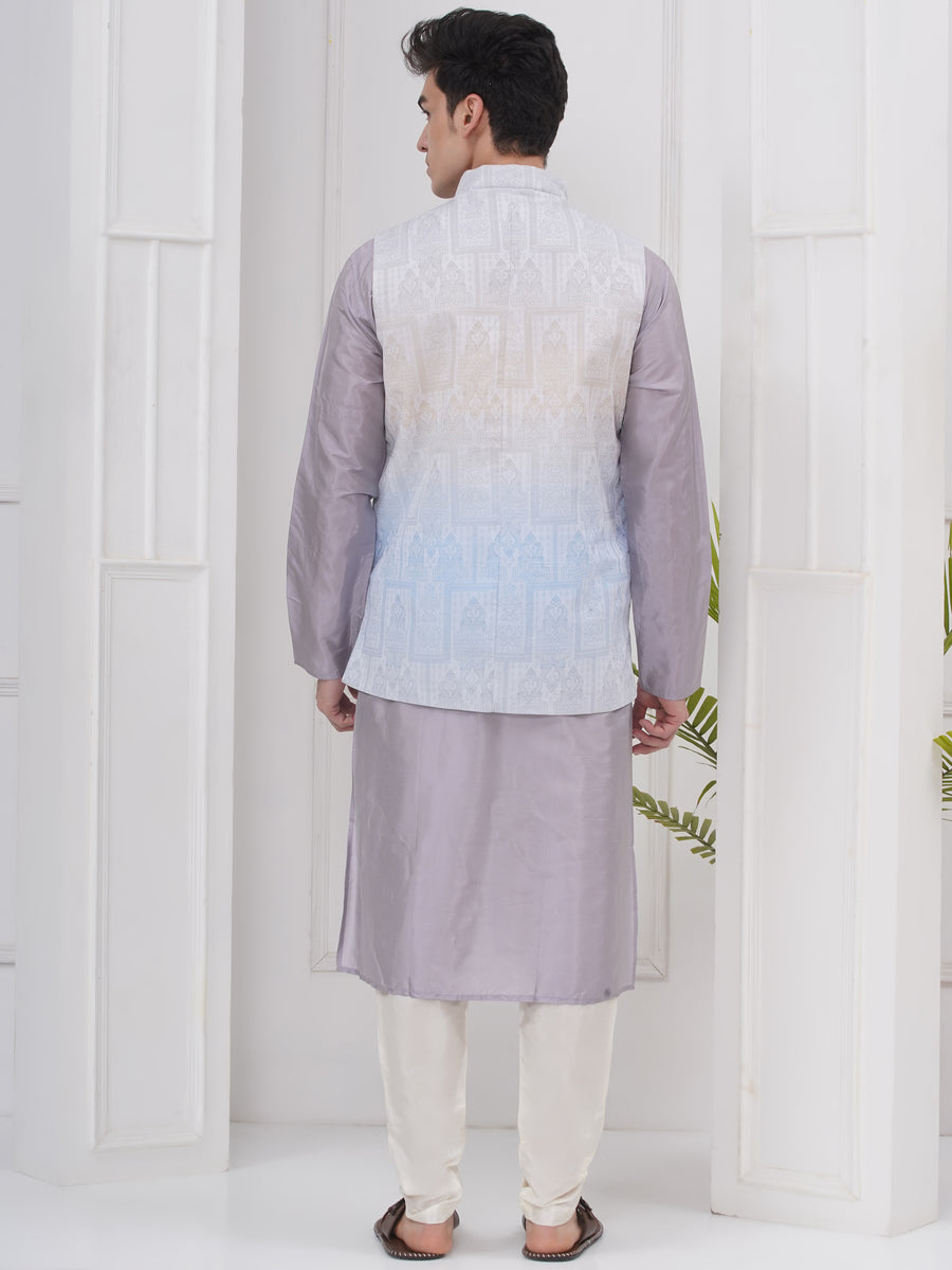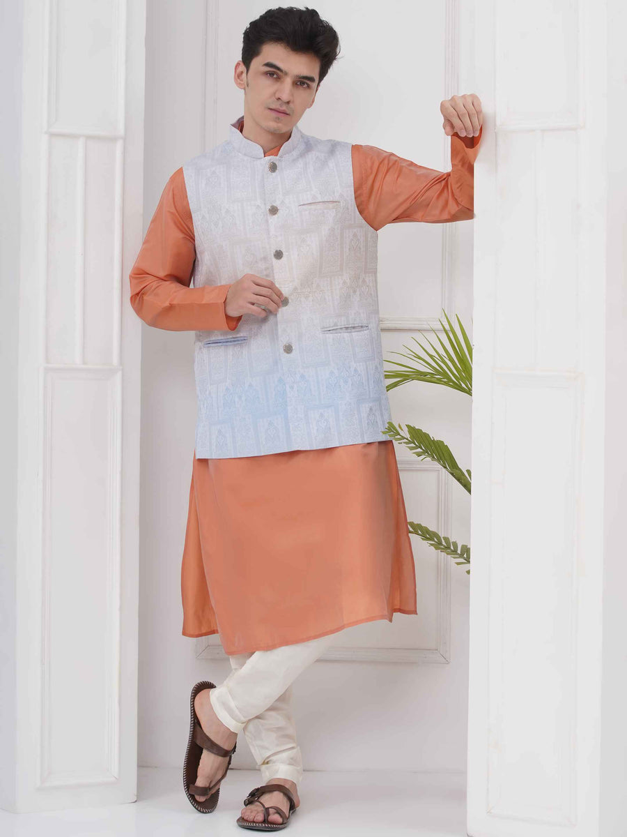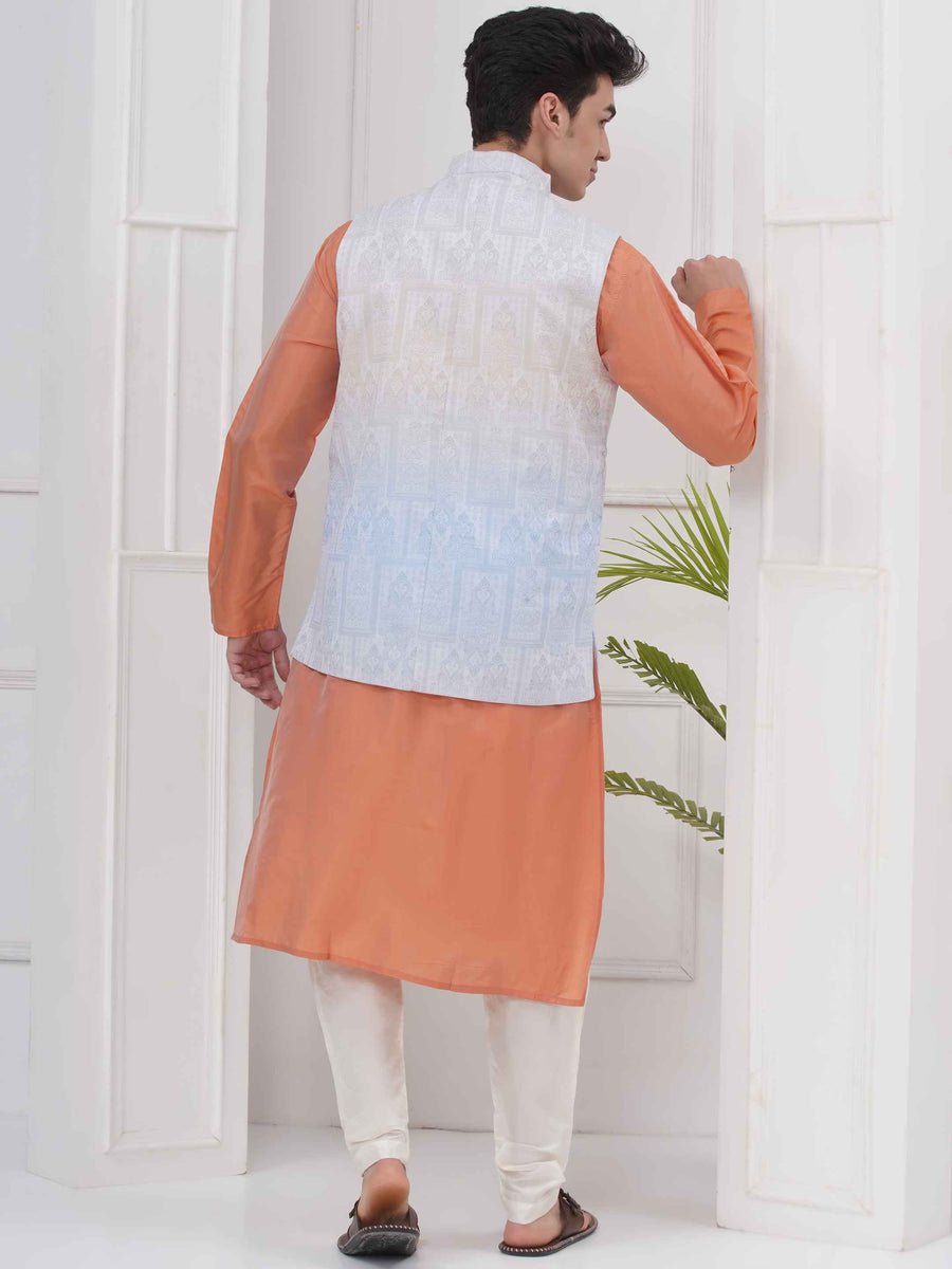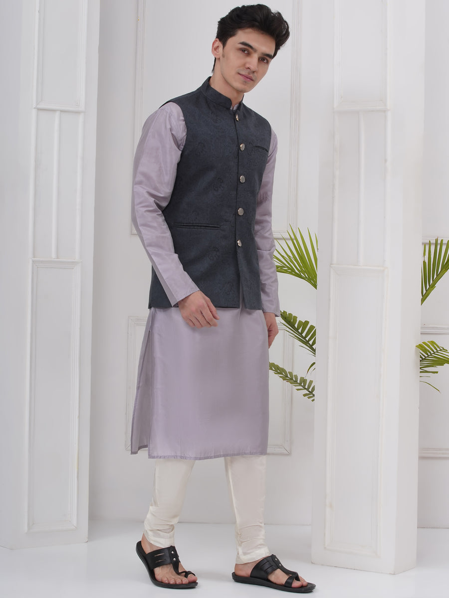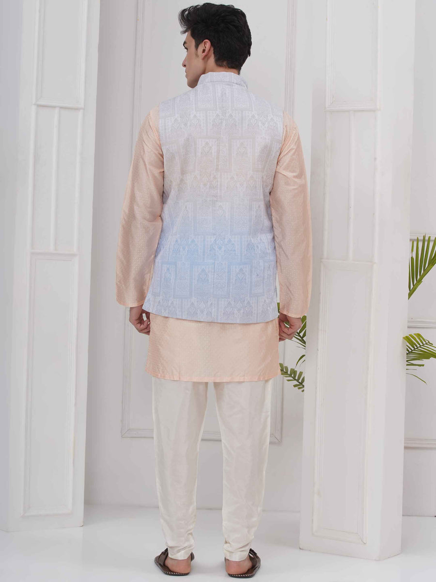 Elevate your ethnic wardrobe with this ready-to-wear three-piece kurta set—a balanced blend of tradition, comfort, and style. Crafted from breathable cotton poplin fabric, the set includes a printed kurta, matching pyjama, and a complementary Nehru jacket designed to complete the look effortlessly.