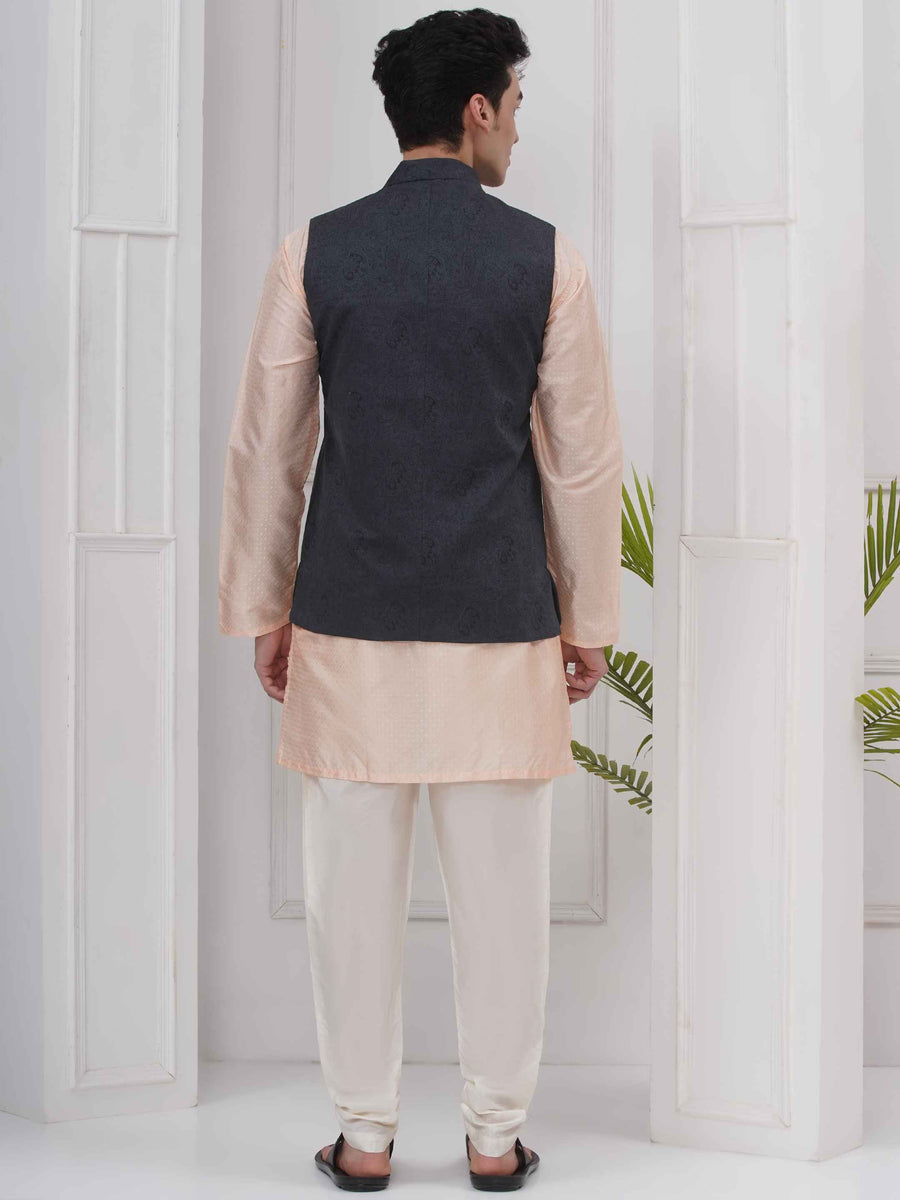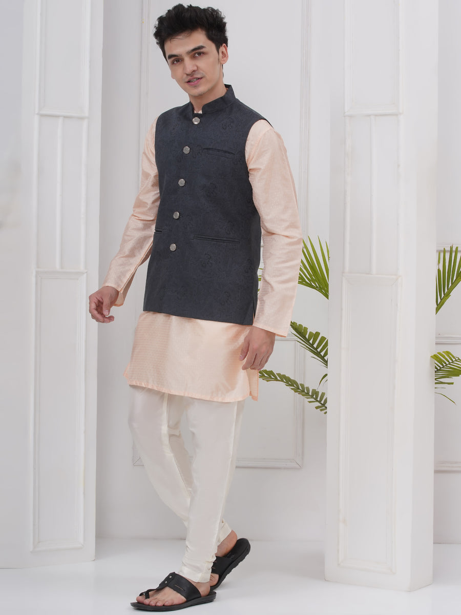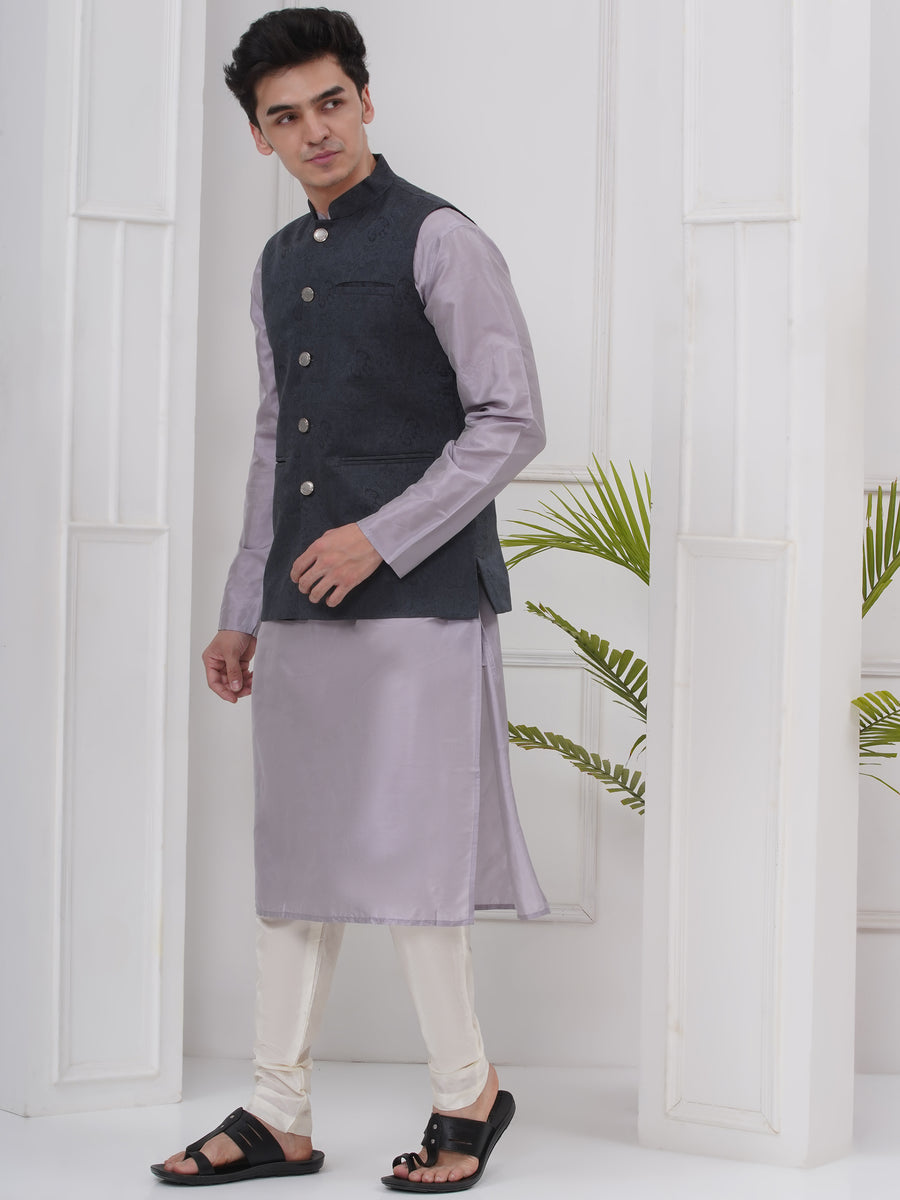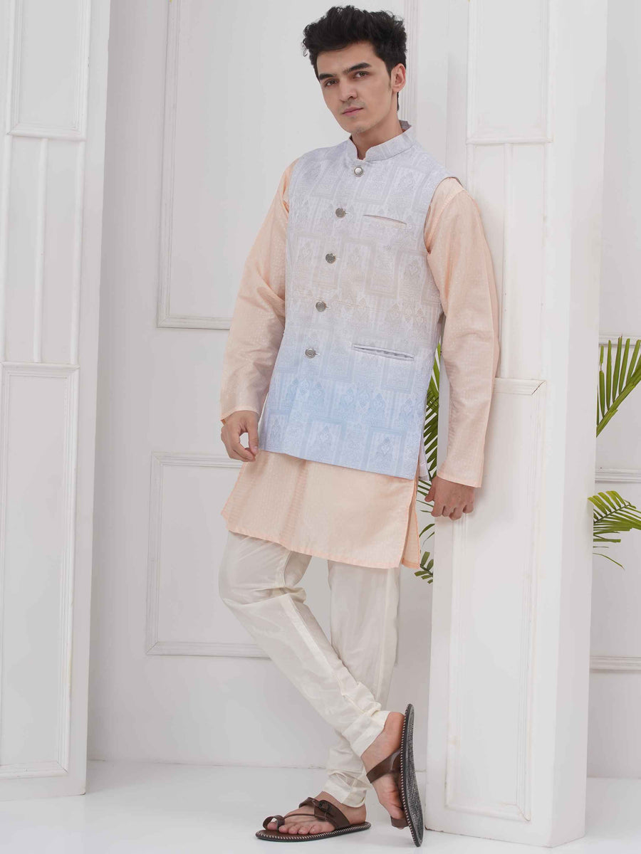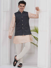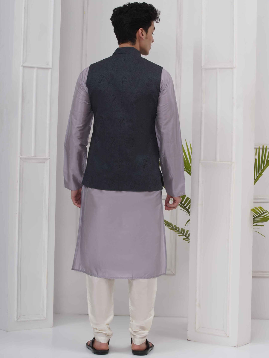 Elevate your ethnic wardrobe with this ready-to-wear three-piece kurta set—a balanced blend of tradition, comfort, and style. Crafted from breathable cotton poplin fabric, the set includes a printed kurta, matching pyjama, and a complementary Nehru jacket designed to complete the look effortlessly.