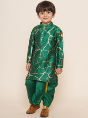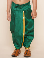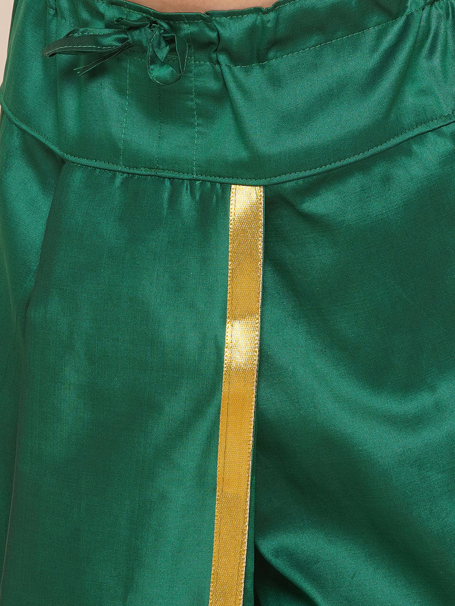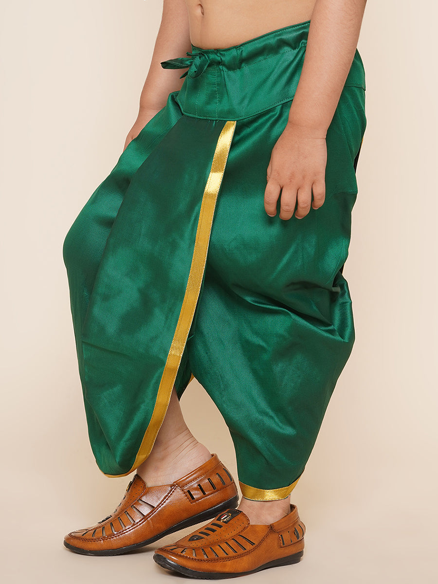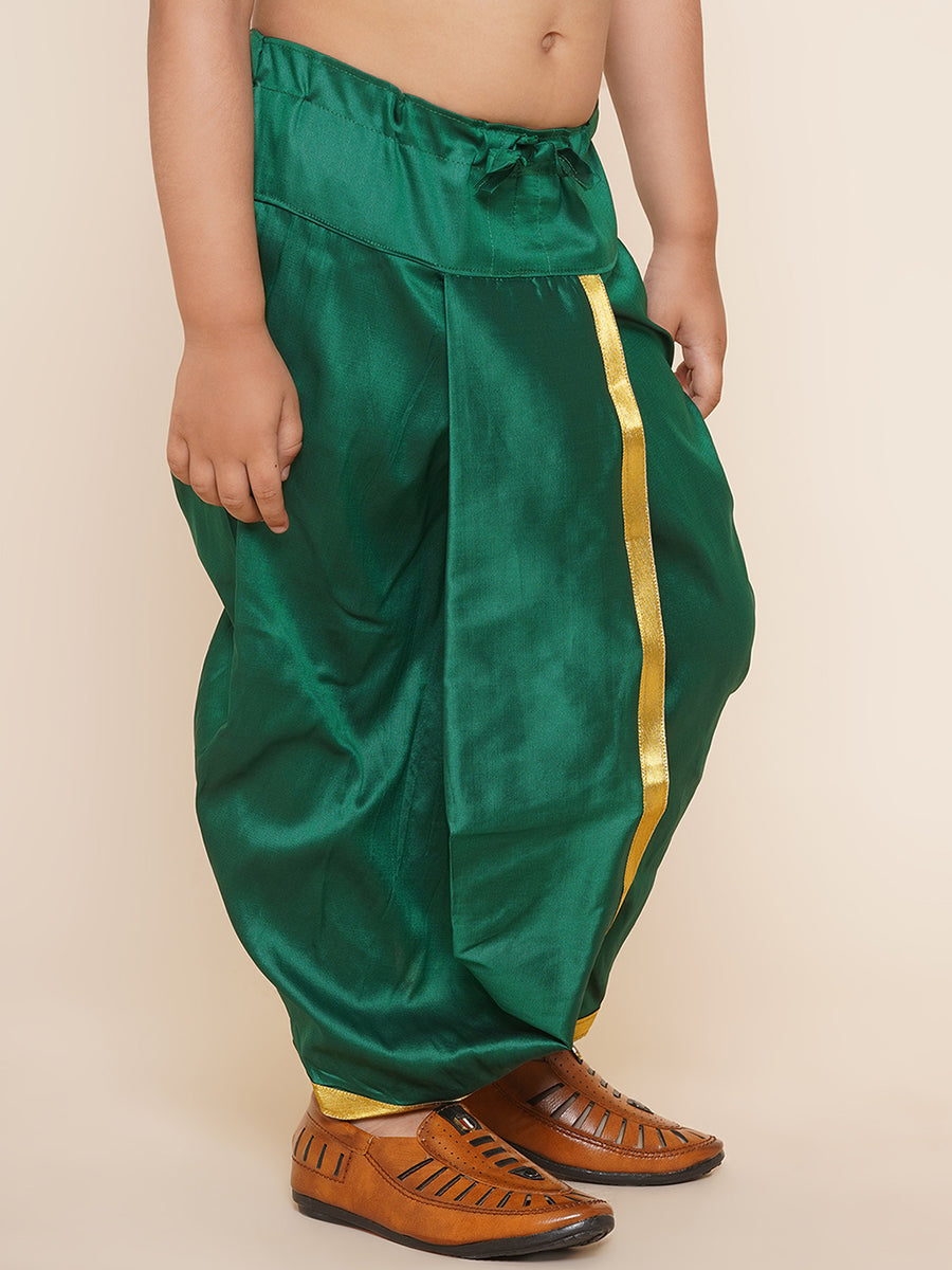 This stylish Boys Green Colour Gold Border Dhotipant is perfect for any occasion. Crafted with drawstring closure and a mandarin collar, it features a luxurious gold border for a touch of elegance. A must-have item for any little boy!