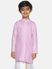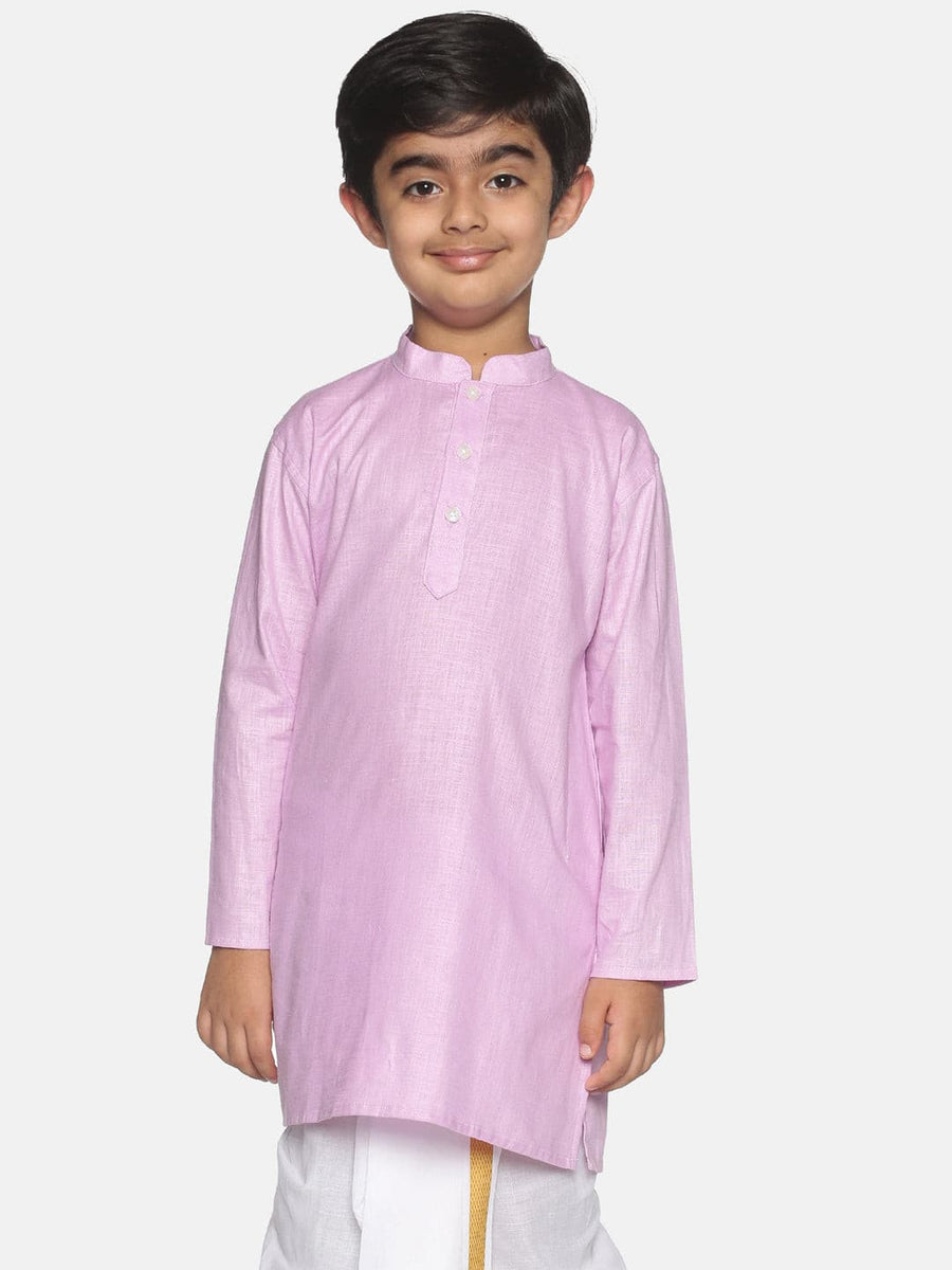 Sethukrishna boys pink colour cotton kurta features a mandarin collar, straight hem and covers upto the knee. Choose to pair it with our regular cotton pyjama or a dhoti pant to dress for an ethnic occasion.