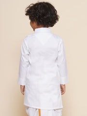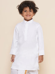 Sethukrishna boys white colour cotton kurta features a mandarin collar, straight hem and covers upto the knee. Choose to pair it with a regular cotton pyjama or a dhoti pant to dress for an ethnic occasion.