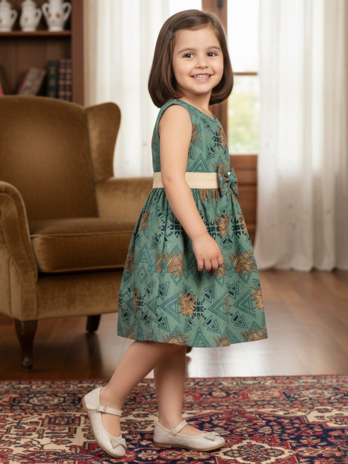 Crafted from a soft and breathable 100% cotton fabric, this knee-length dress features digital prints, bringing warmth and elegance to any occasion. The sleeveless design ensures ease of movement, while the flared skirt and a cute bow at the waist add playful charm.