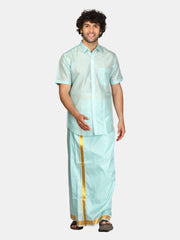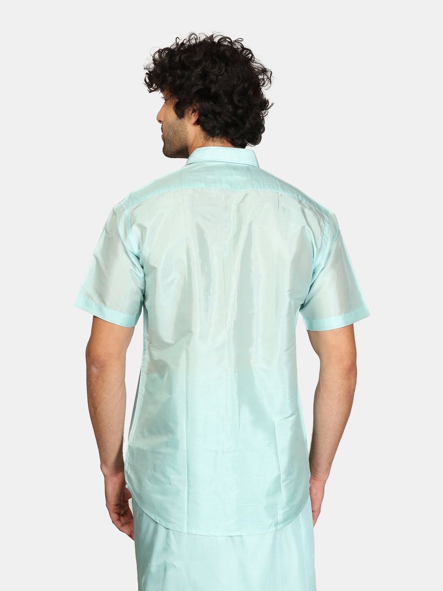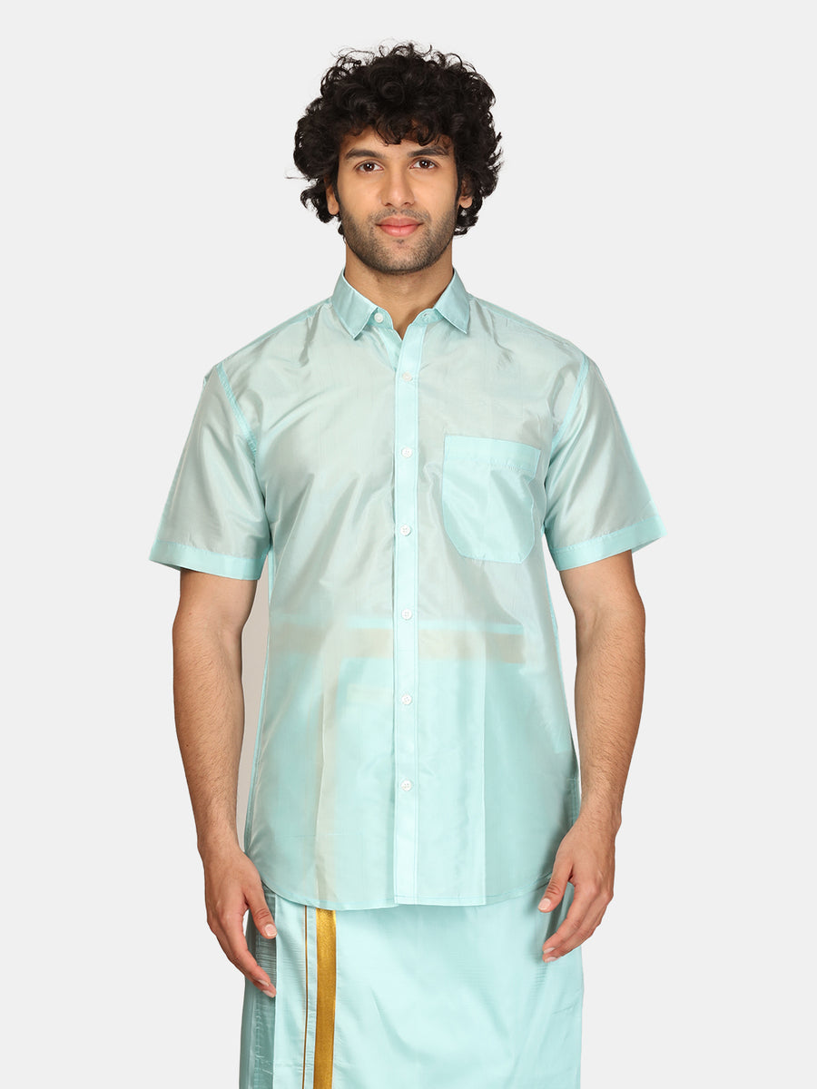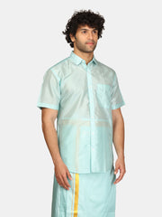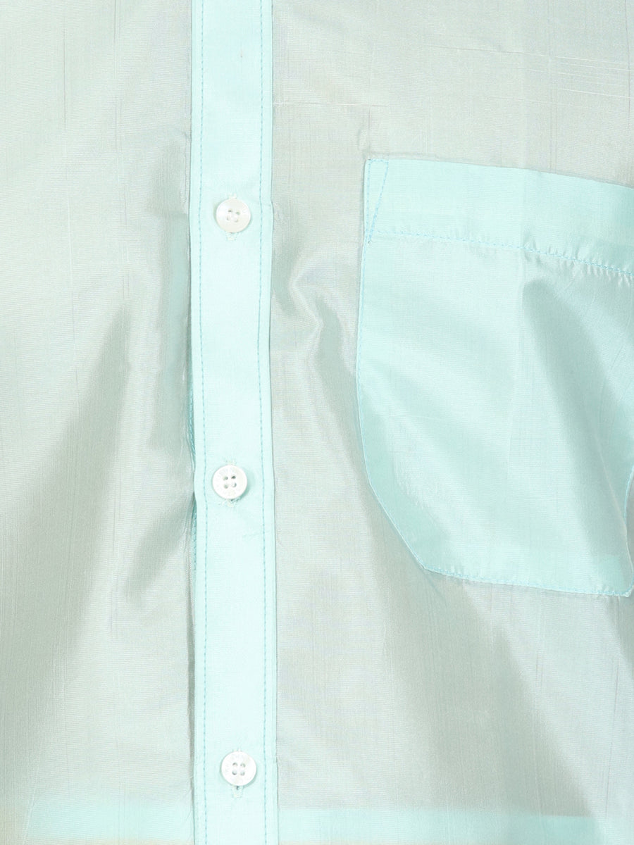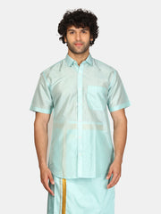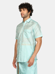 Sethukrishna men's Blue Artsilk shirt features a spread collar with half-length sleeves and button placket, as well as a stylish patch pocket. Perfect to pair with a traditional dhoti for a complete ethnic look.