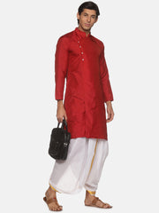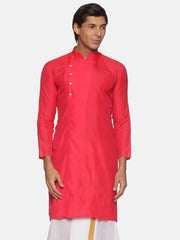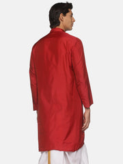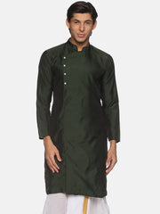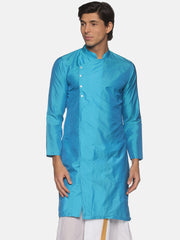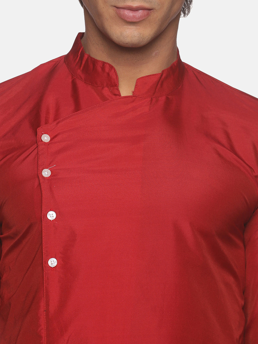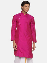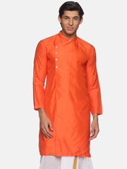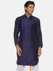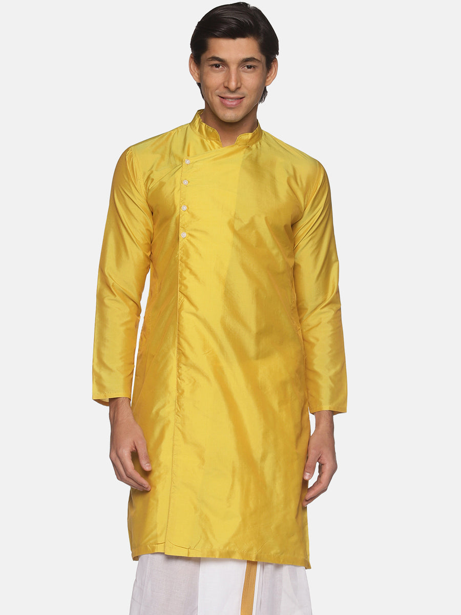 Sethukrishna men polyester designer kurta features a mandarin collar, side pockets, full sleeves, multiple slits and asymmetric hem. Wear it with plain solid pyjama to a wedding or party with style and elegance.