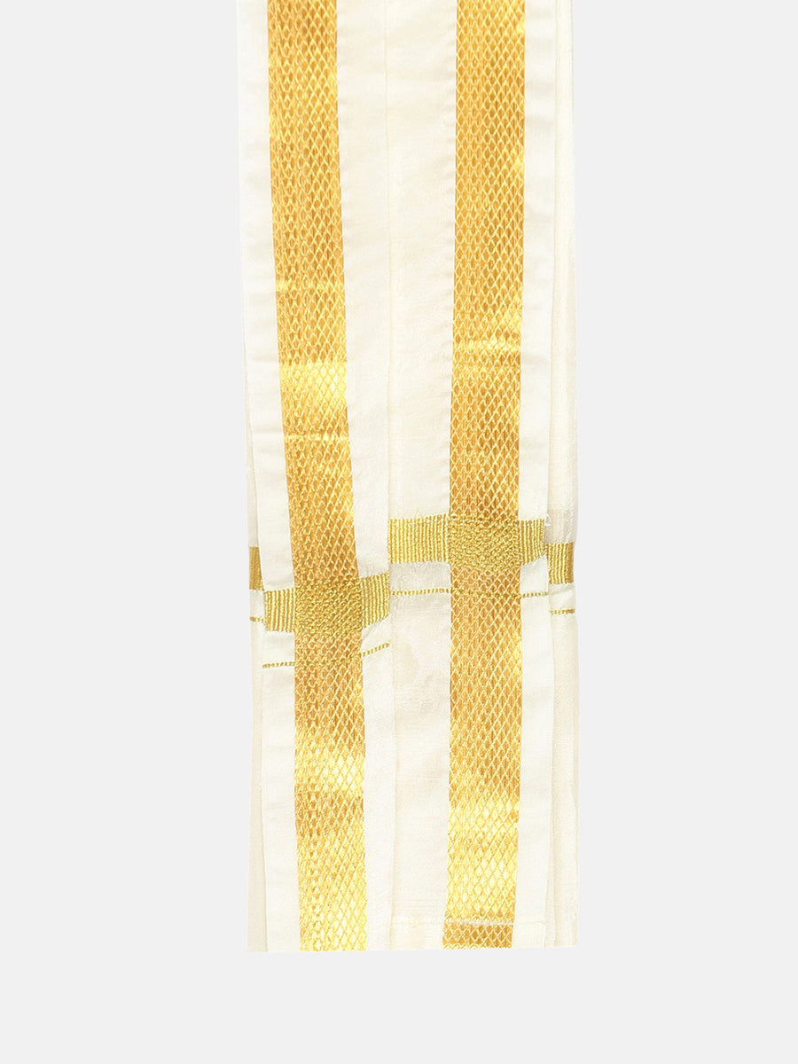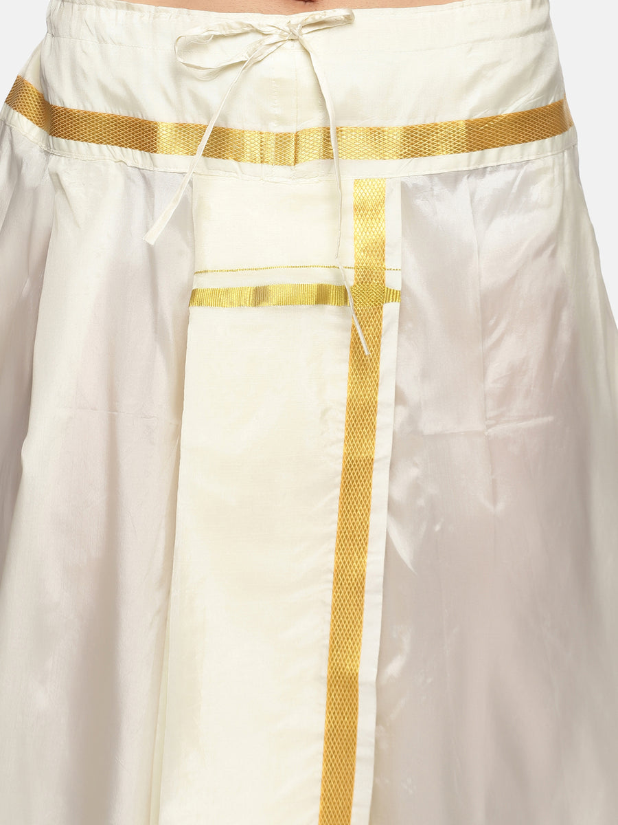 This kurta dhoti pant set for men is designed and crafted from sethukrishna. The kurta is made of cream artsilk featuring mandarin collar, side pockets, full sleeves and straight hem and it is paired with cream silk pant with gold jari border. Choose to wear it for any traditional occasion in style.