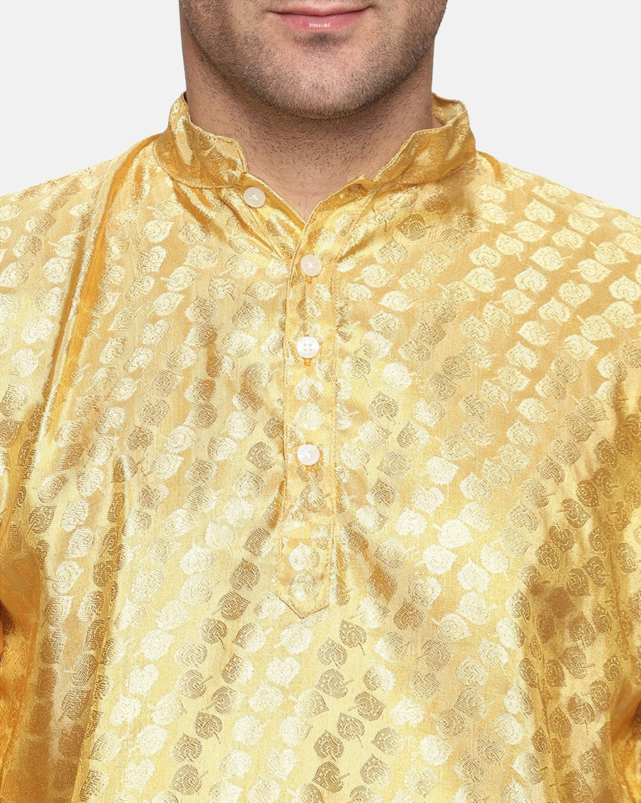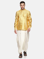 This kurta dhoti pant set for men is designed and crafted from sethukrishna. The kurta is made of gold polyester material featuring mandarin collar, full sleeve, side pockets and it is paired with cream artsilk pant with light weight and adjustable drawstring closure. Choose to wear it for any traditional occasion in style.