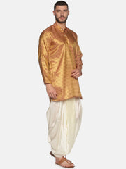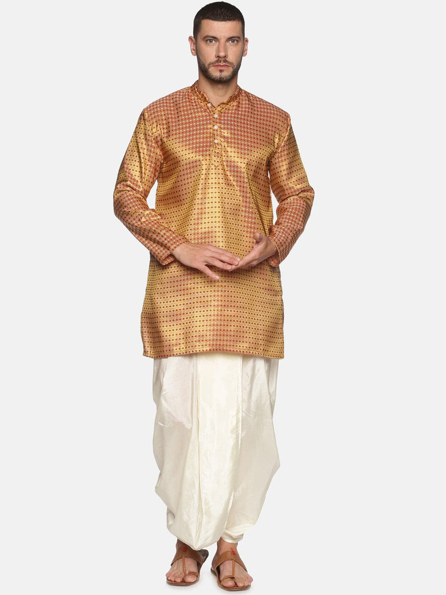 This kurta dhoti pant set for men is designed and crafted from sethukrishna. The kurta is made of gold polyester material featuring mandarin collar, full sleeve, side pockets and it is paired with cream artsilk pant with light weight and adjustable drawstring closure. Choose to wear it for any traditional occasion in style.