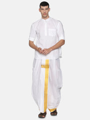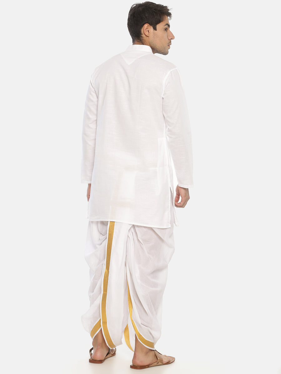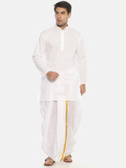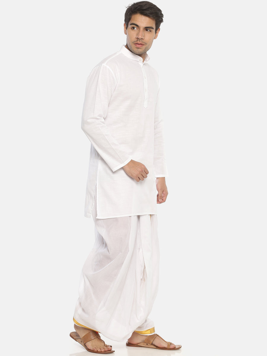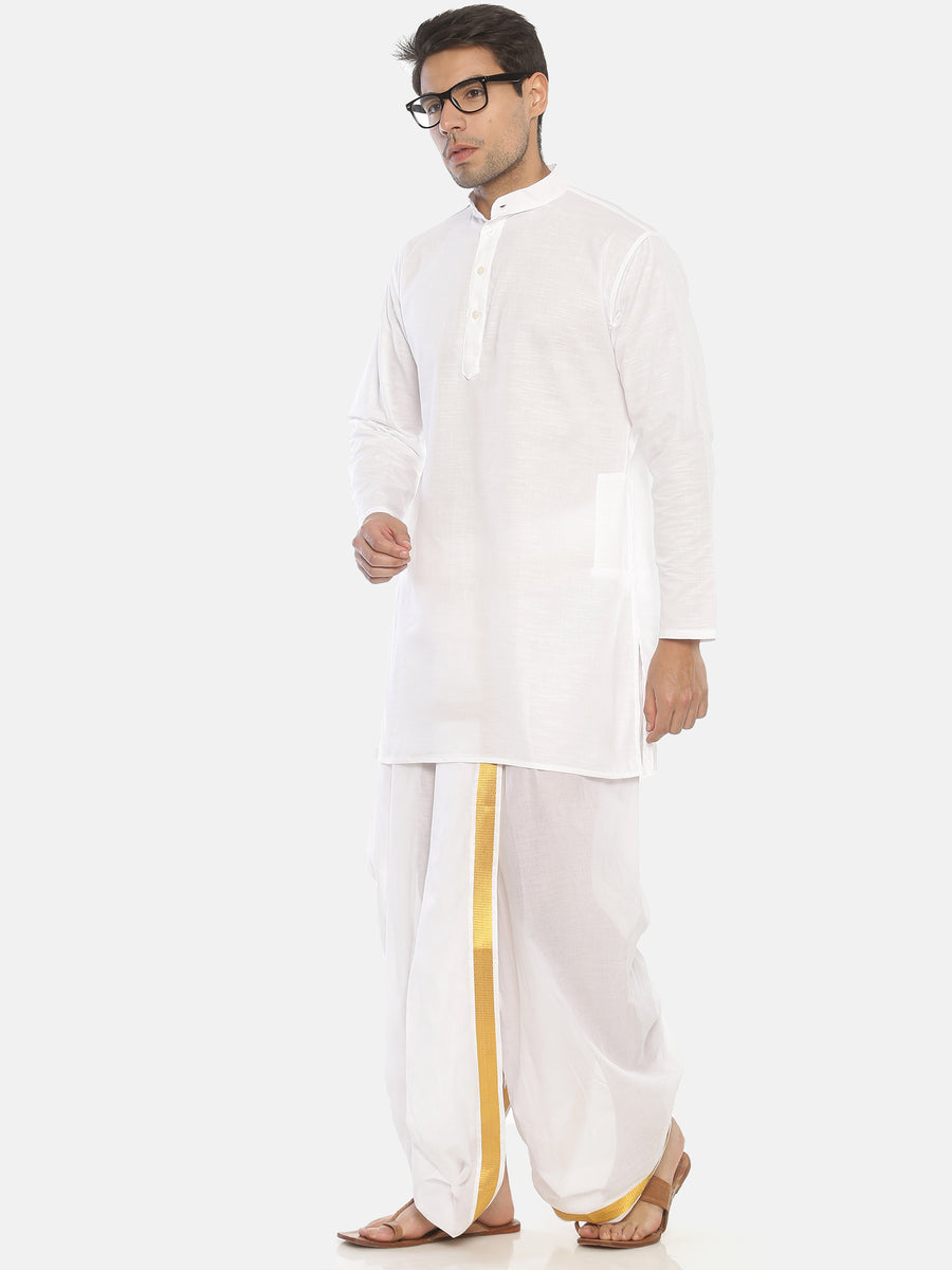 This kurta dhoti pant for men is designed and crafted from sethukrishna. The kurta features a mandarin collar, full sleeves and a straight hem and is paired with a comfortable dhoti pant with adjustable drawstring. Pose majestically with this knee length kurta and traditional dhoti pant to make a complete ethnic outfit