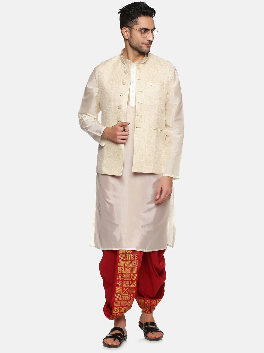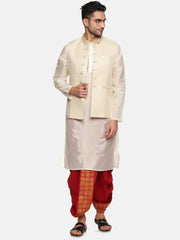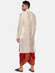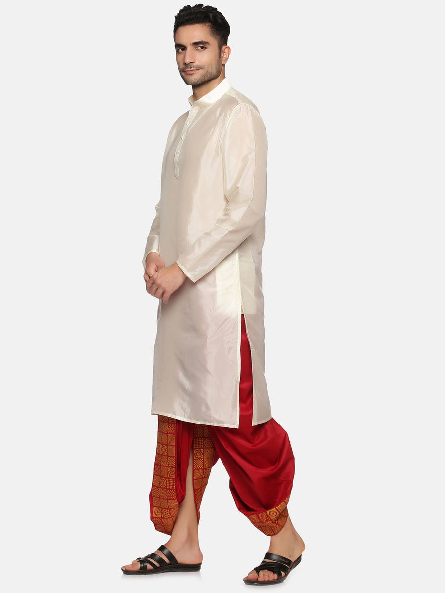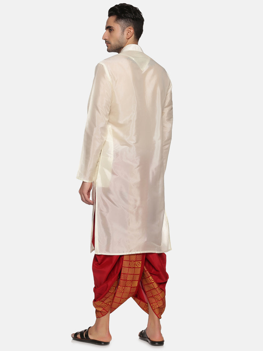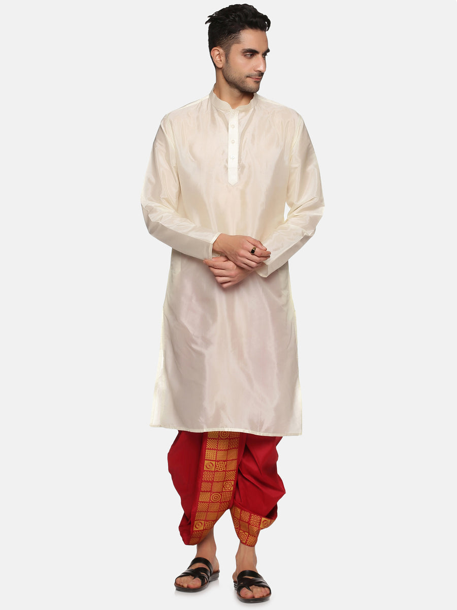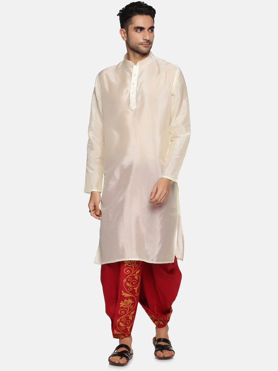 This kurta dhoti pant set for men is designed and crafted from sethukrishna. The kurta is made of cream artsilk material featuring mandarin collar, full sleeves, side pockets, straight hem and it is paired with maroon polyester dhoti pant with a printed front panel and drawstring closure. Choose to wear it for any traditional occasion in style.