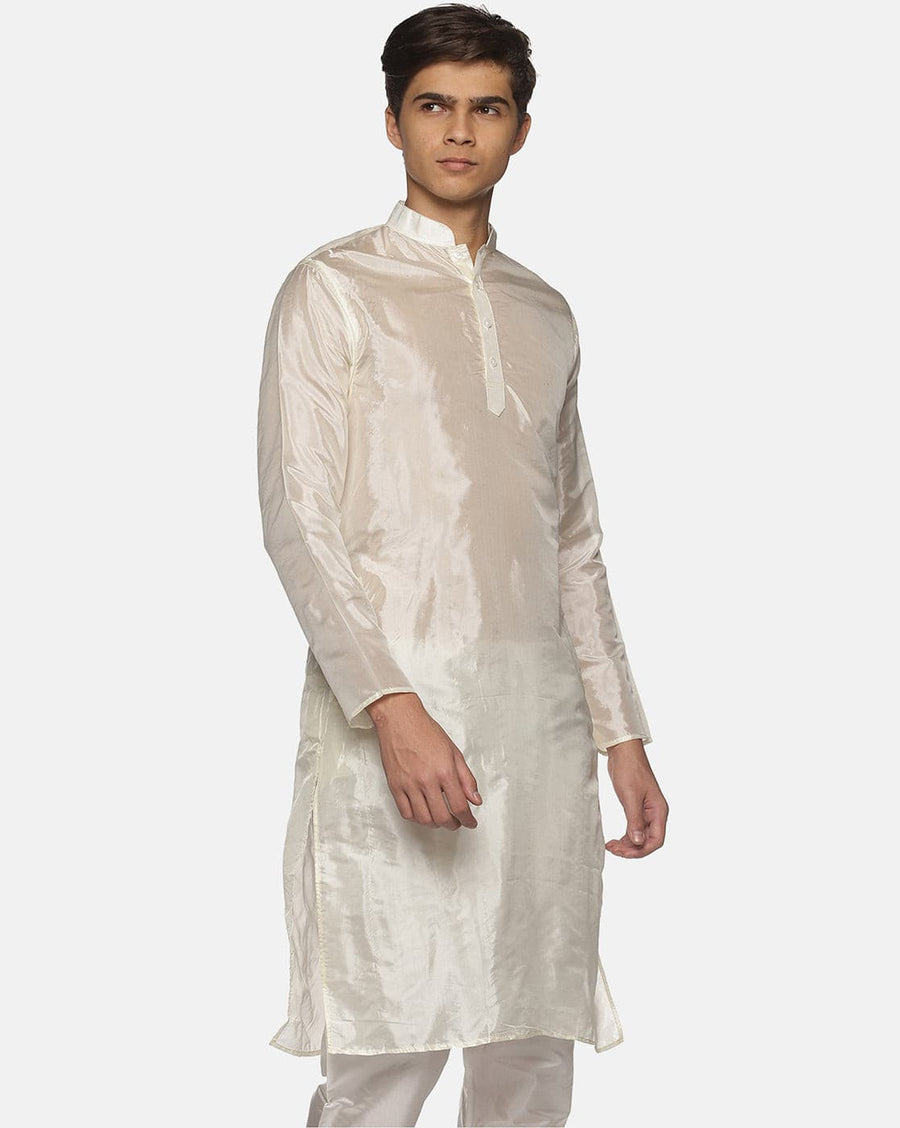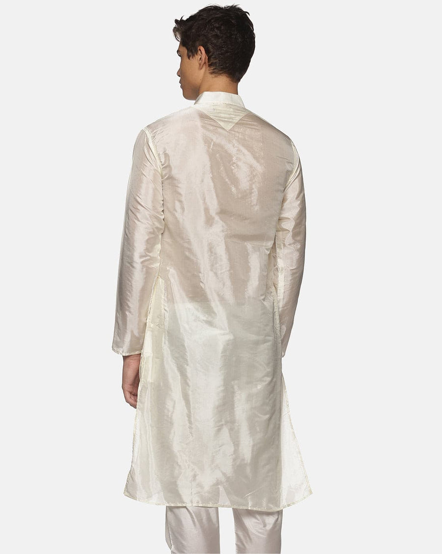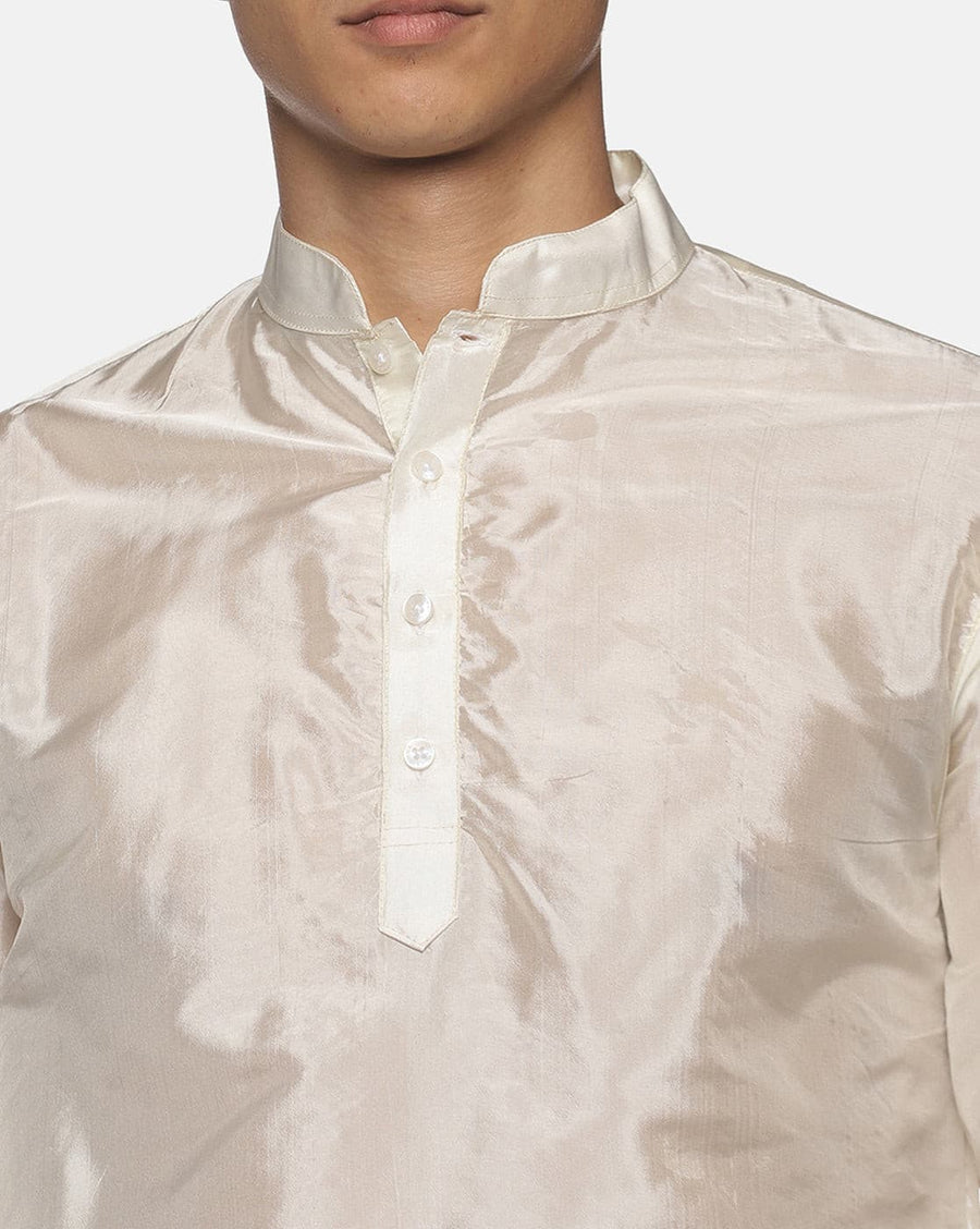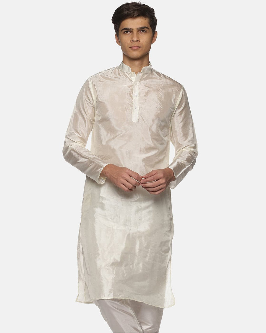 This kurta for men is designed and crafted from Sethukrishna and features a mandarin collar, full sleeves and straight hem. Pose majestically with this knee length kurta with a traditional dhoti pant to make a complete ethnic outfit.