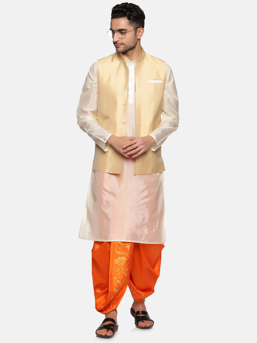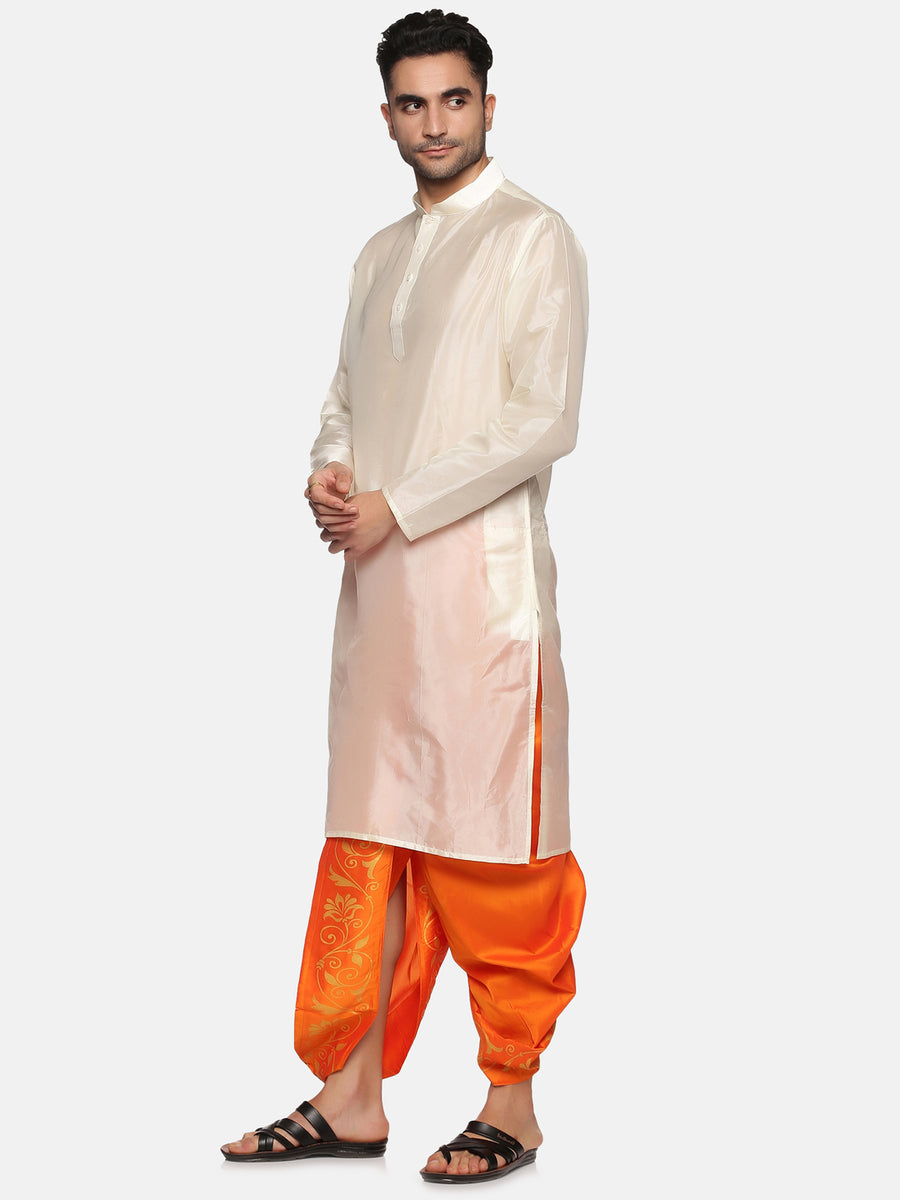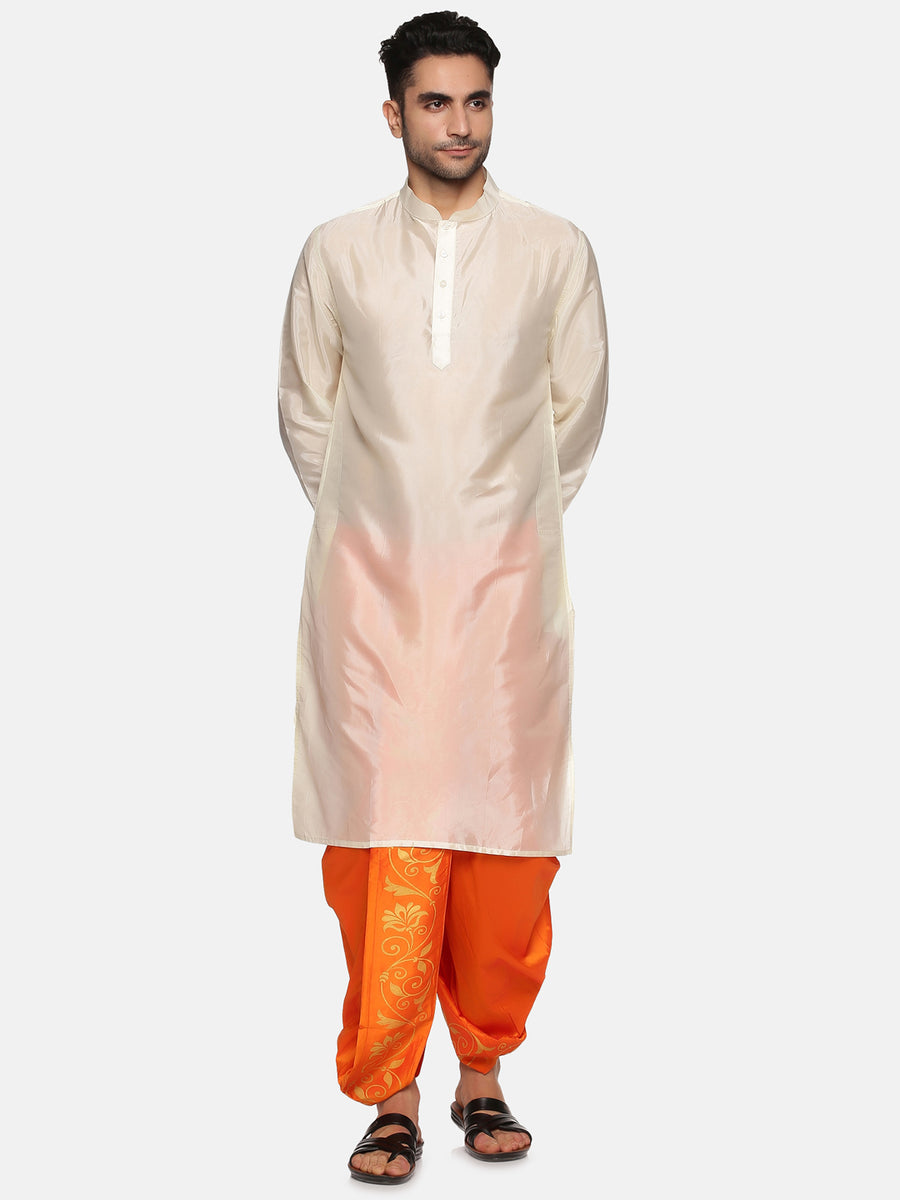 This kurta dhoti pant set for men is designed and crafted from sethukrishna. The kurta is made of cream artsilk material featuring mandarin collar, full sleeves, side pockets, straight hem and it is paired with orange polyester dhoti pant with printed front panel and drawstring closure. Choose to wear it for any traditional occasion in style