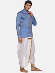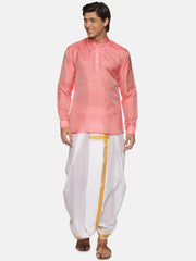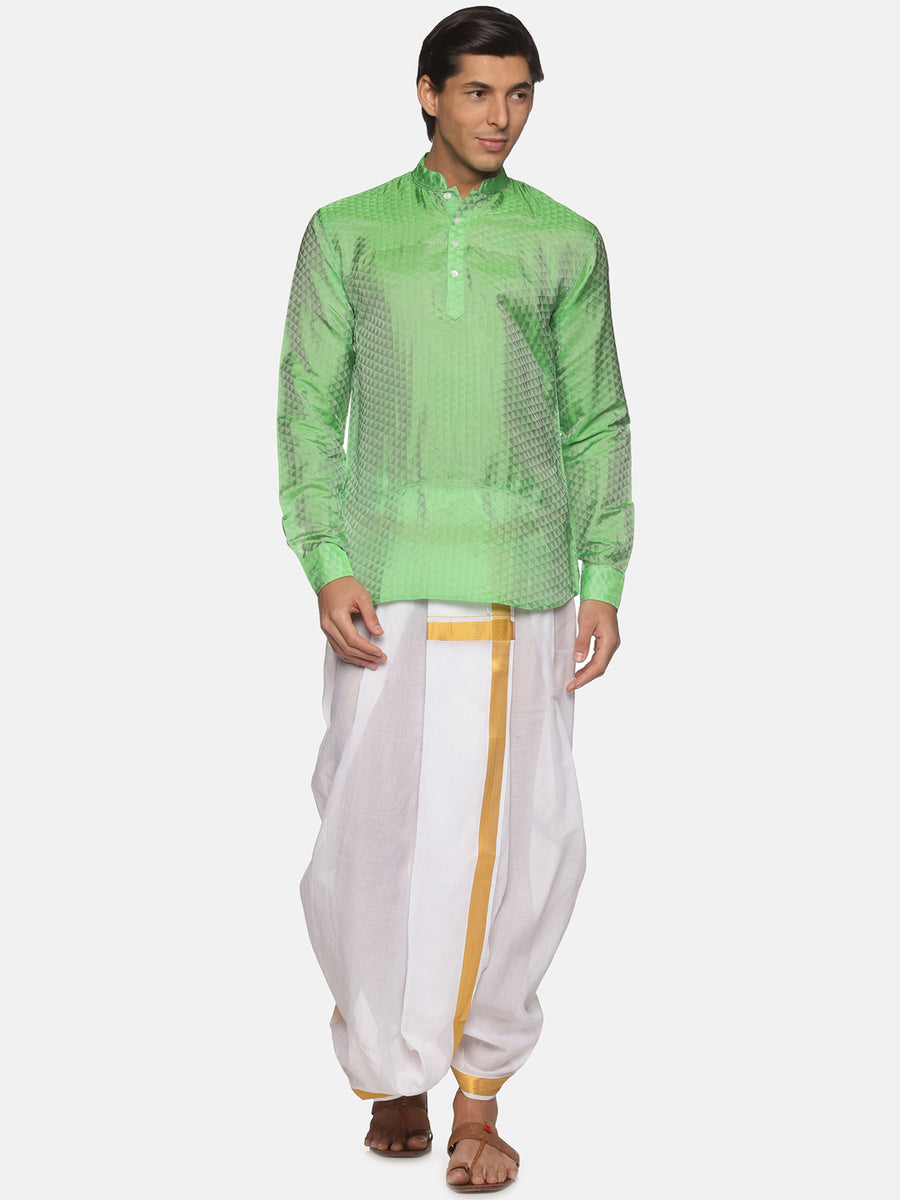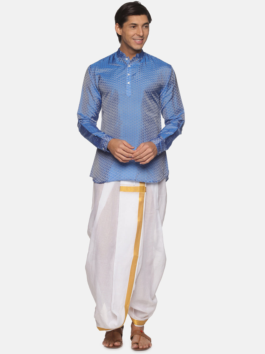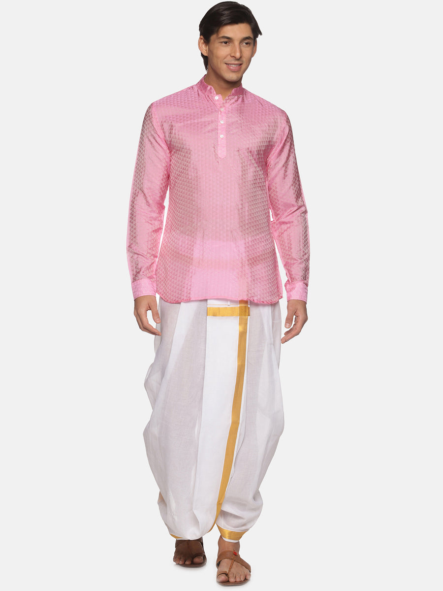This kurta dhoti pant for men is designed and crafted from Sethukrishna. The kurta features a mandarin collar, full sleeves and a straight hem and is paired with a comfortable dhoti pant with adjustable drawstring. Pose majestically with this knee length kurta and traditional dhoti pant to make a complete ethnic outfit.