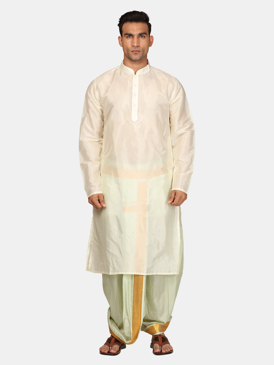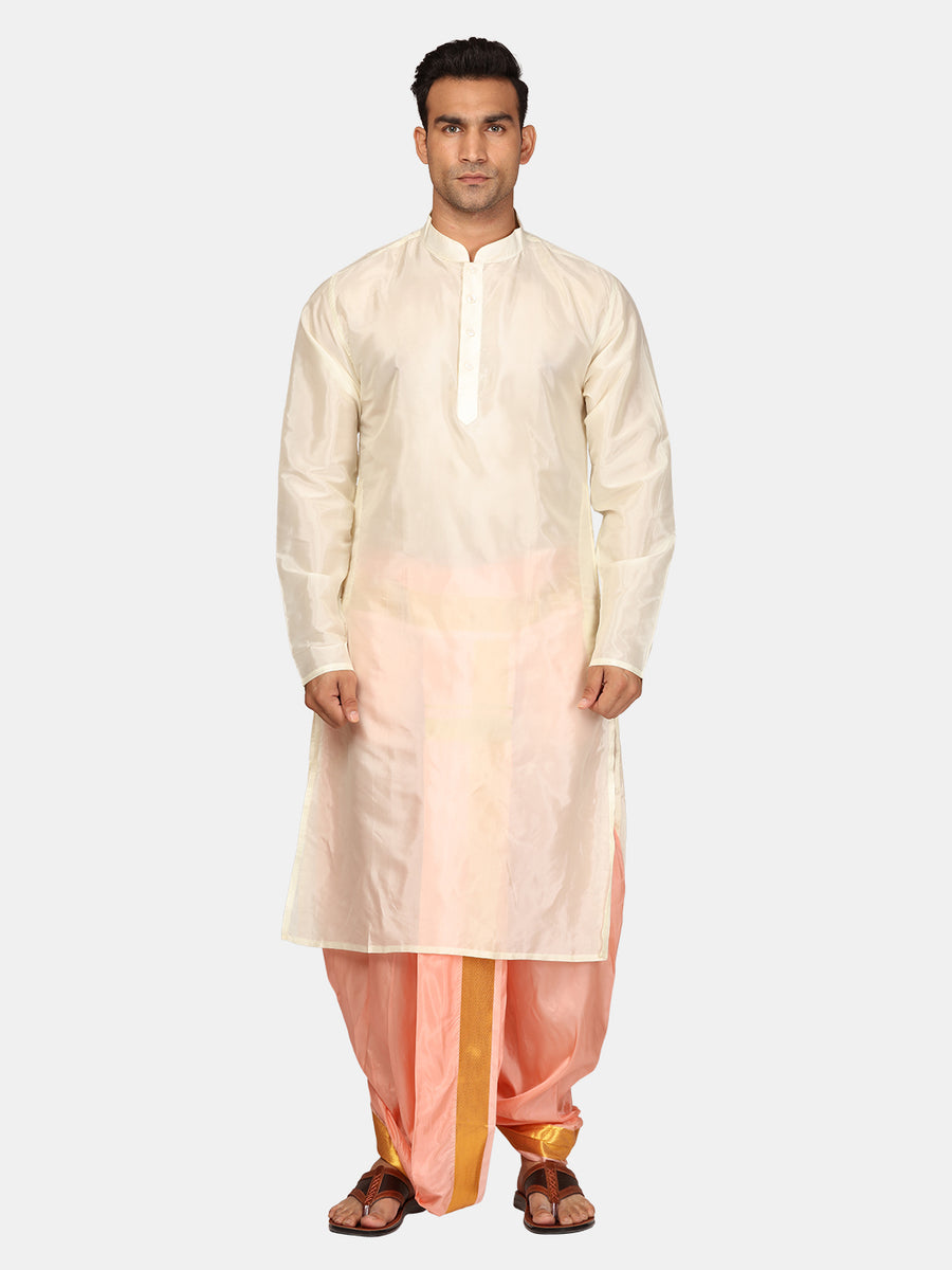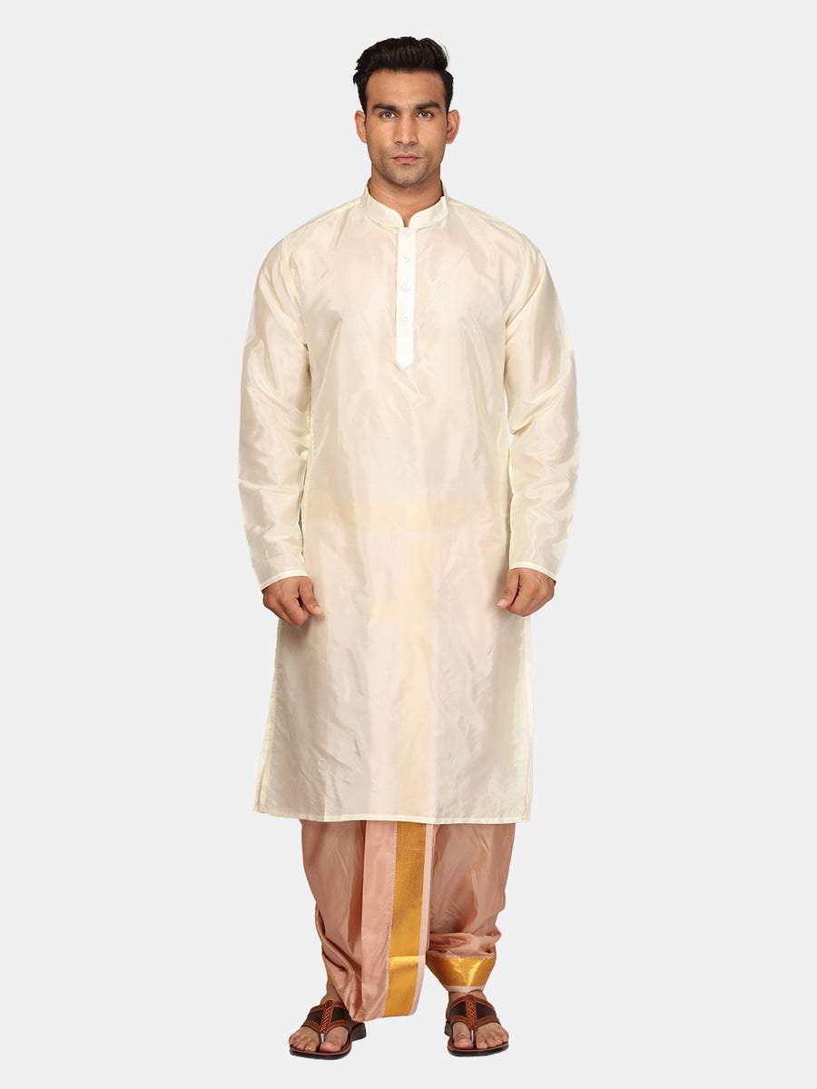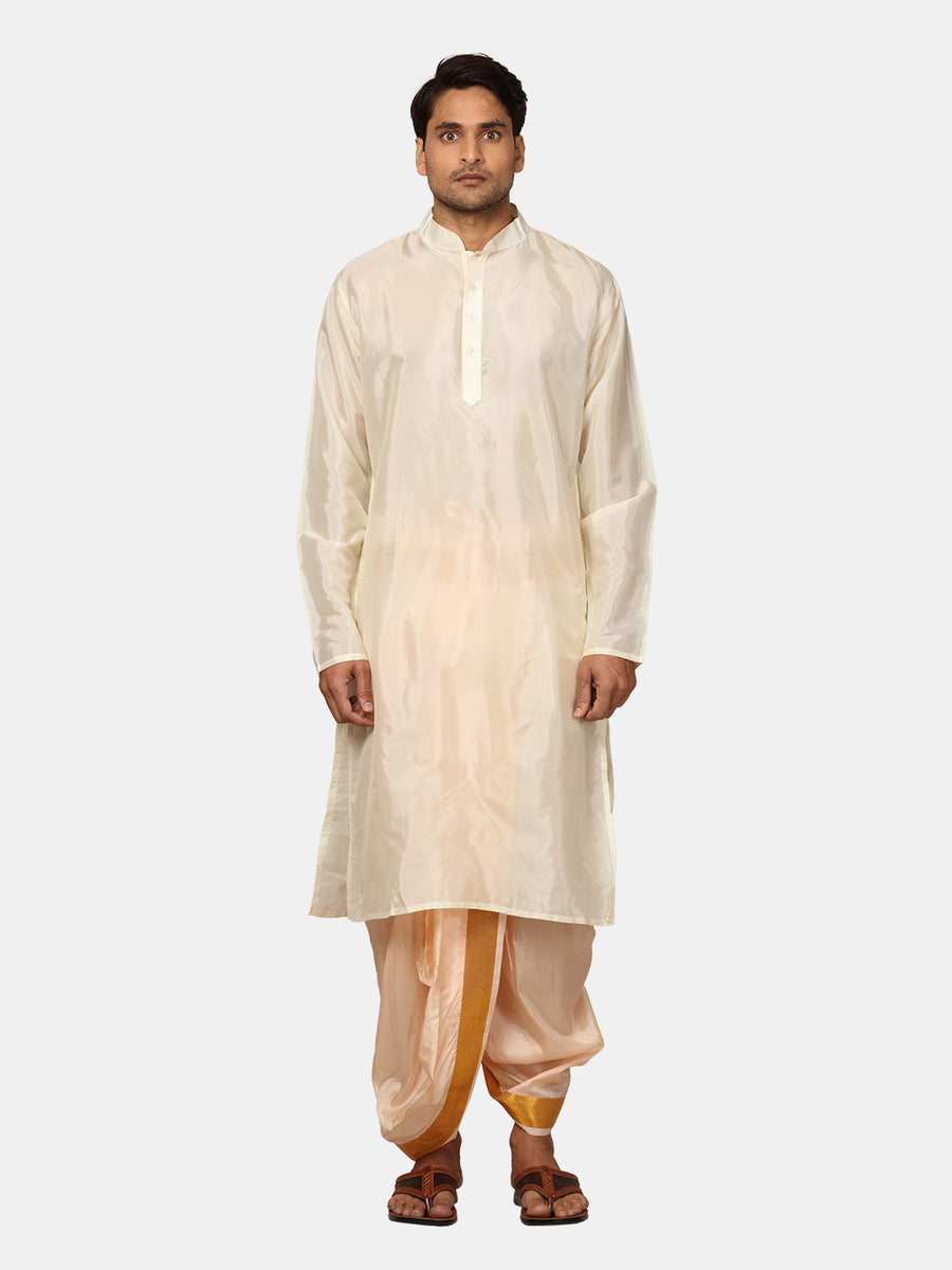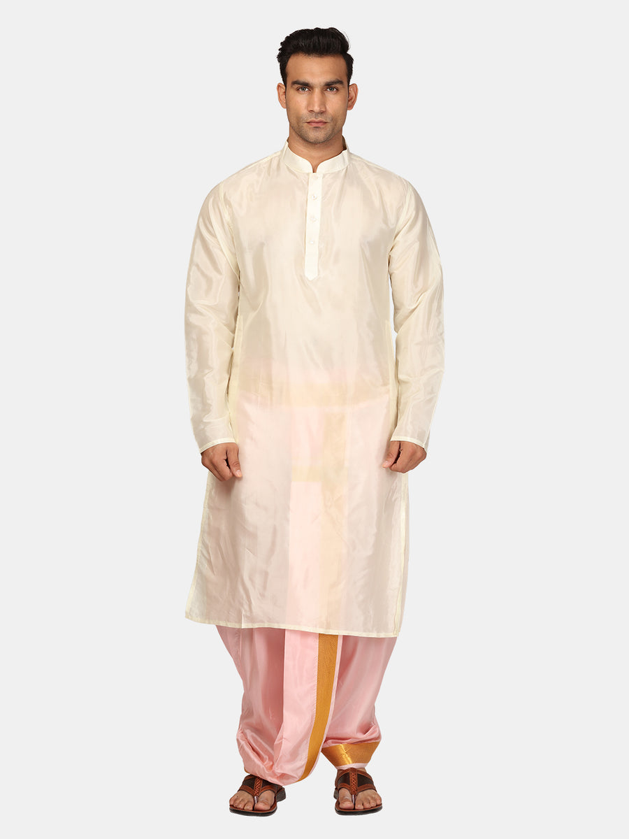 Stay timelessly stylish in this Sethukrishna Men Kurta dhotipant Set. Crafted from a solid cream kurta, this set also includes a solid colour dhoti pant, providing a classic look. Enjoy maximum comfort and unbeatable style with this traditional piece.
