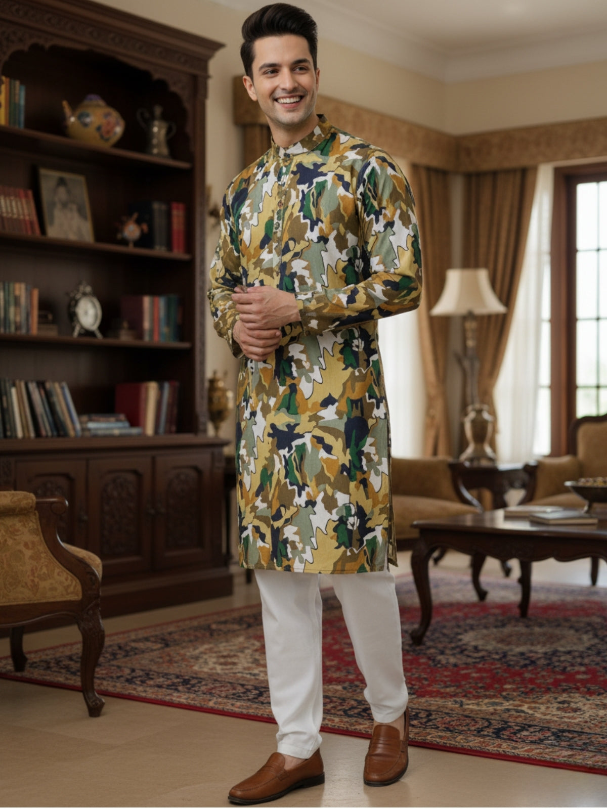 Men's stylish digital print cotton kurta, designed for comfort and traditional charm. Made from 100% breathable cotton, this kurta is perfect for festive occasions, family gatherings, or cultural events. Featuring a smart mandarin collar, classic button closure, and a straight hemline, this kurta combines modern style with timeless design. The functional side pockets add convenience, while the vibrant digital print design gives it a trendy look.