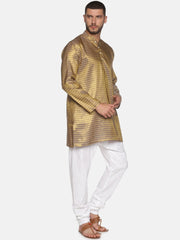 This kurta pyjama set for men is designed and crafted from sethukrishna. The kurta is made of gold polyester material featuring mandarin collar, full sleeve, curved hem and it is paired with cotton white pyjama with adjustable drawstring closure. Choose to wear it for any traditional occasion in style.