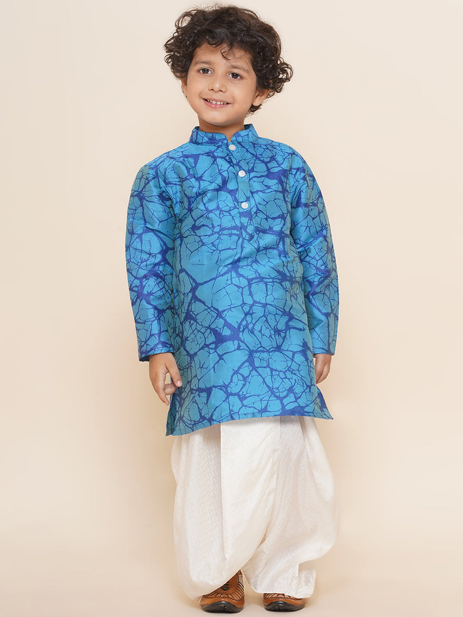 Everything crafted at Sethukrishna has been inspired by our Indian tradition. Boys' art silk kurta features a mandarin collar, straight hem and side pockets. Pair it with designer dhoti pants for an expression of refined and effortless way of dressing.