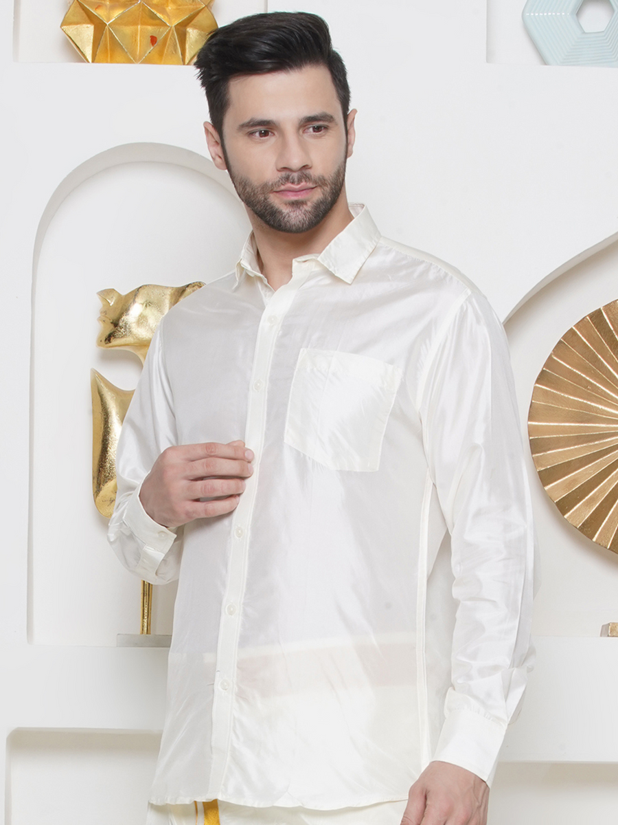 Experience the luxurious comfort of our Sethukrishna Mens Pure Silk Shirt. Made from soft and lustrous silk, this cream-colored shirt features a solid design, perfect for any occasion. Feel confident and stylish in this high-quality, pure silk shirt.