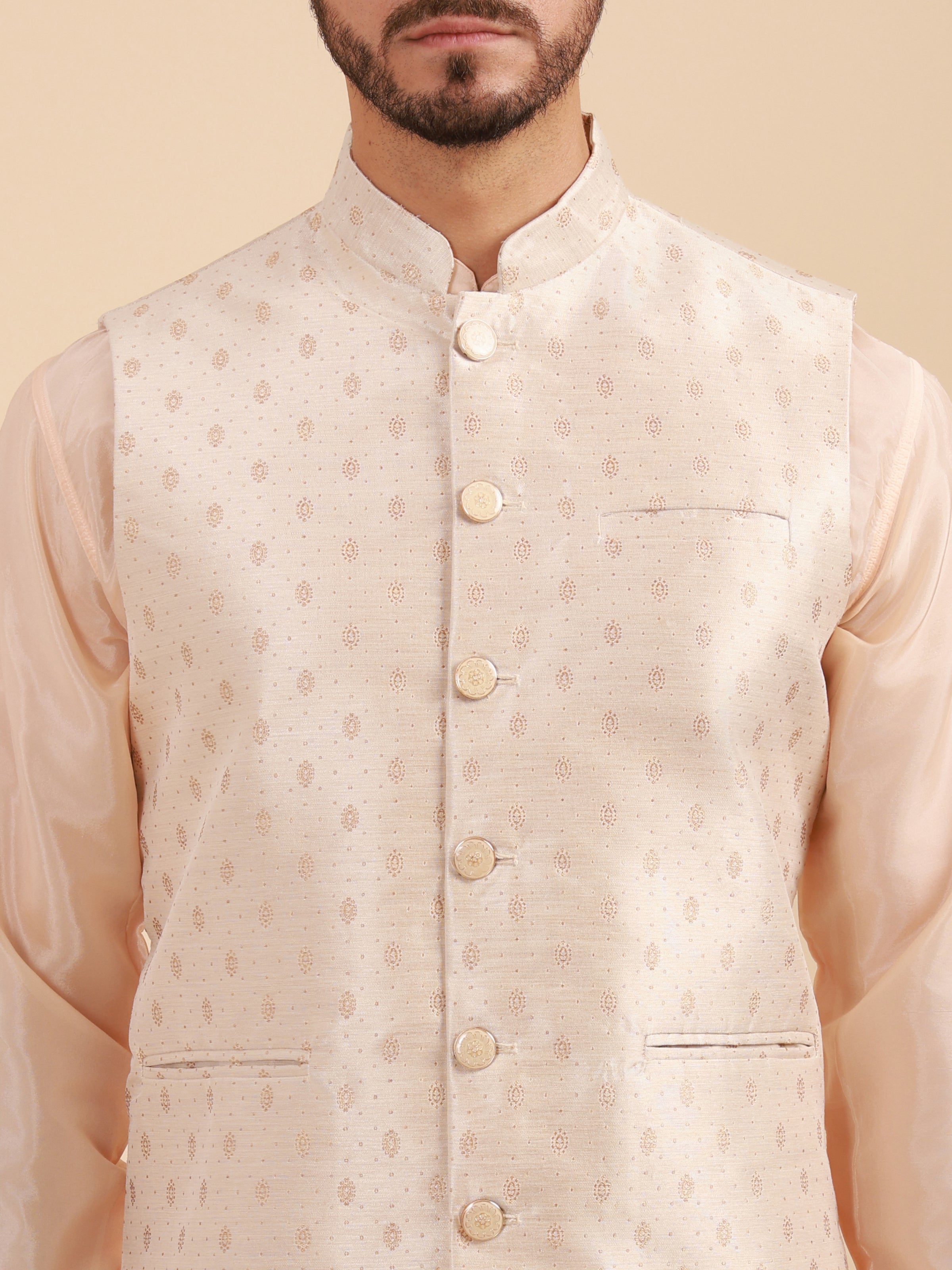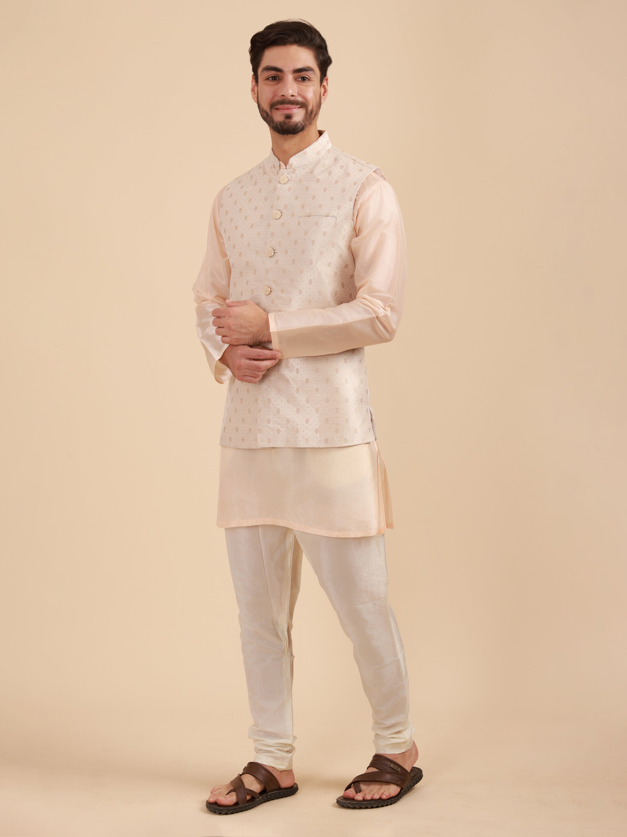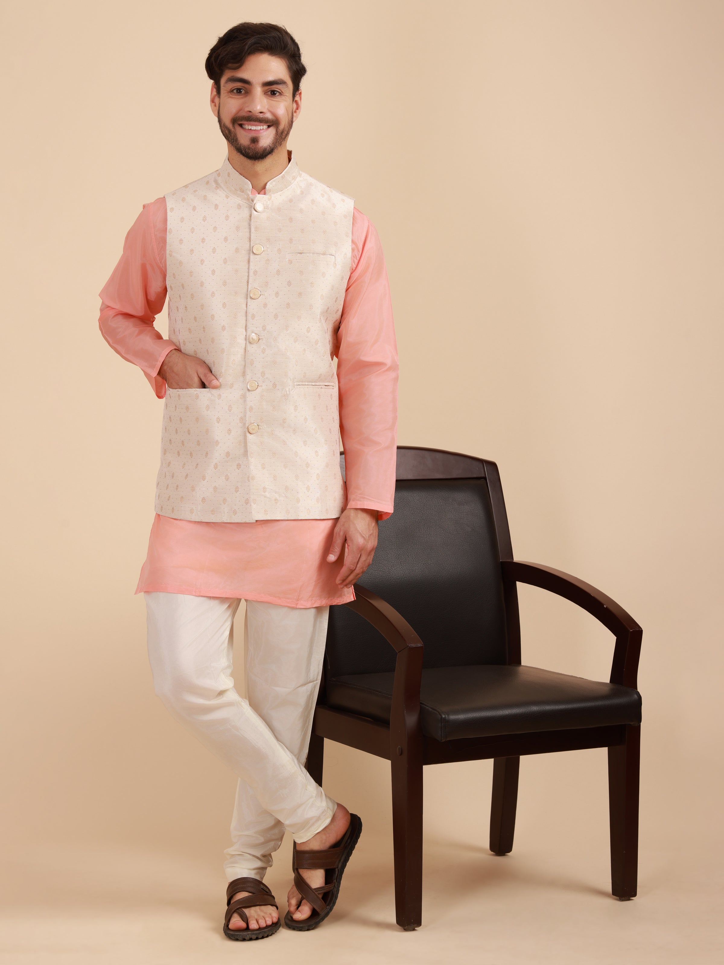 Men Art Silk Kurta & Pyjama Set with Nehru Jacket. Kurta Made From Art Silk Material Features Mandarin Collar Long Sleeves Side Pockets & Straight Hem. The Pyjama Features Elasticated Waist Band and Side Pockets. Regular Fit Nehru Jacket Features Jacquard Design and Designer Buttons.